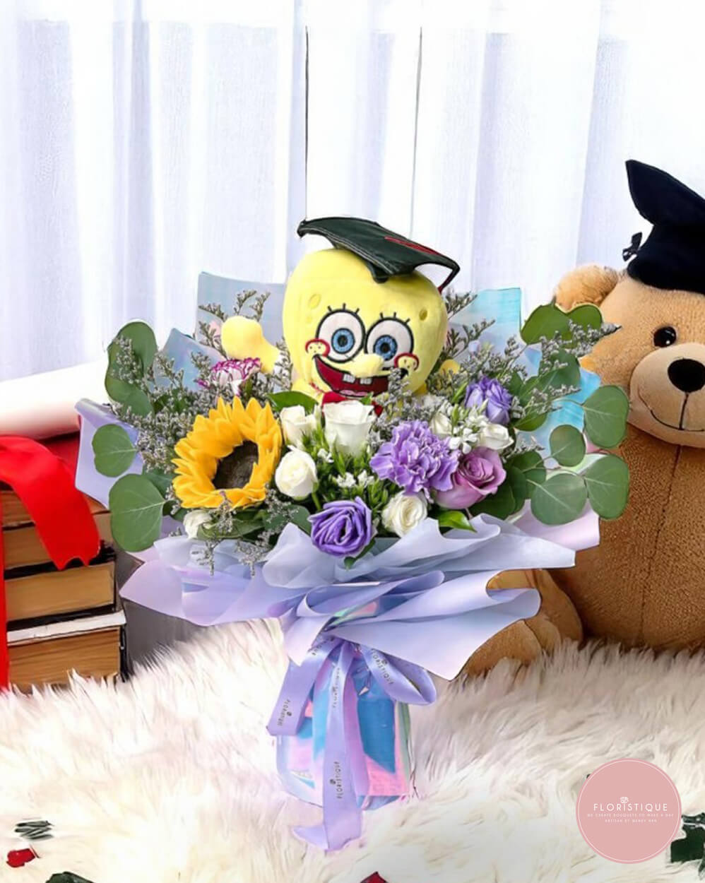 Celebrate their big day with a playful twist! This bouquet features a bright sunflower, pastel roses, and fresh blooms, topped with a cheerful Spongebob plush in a graduation cap. It’s a fun and memorable way to congratulate your loved one while bringing smiles and laughter.