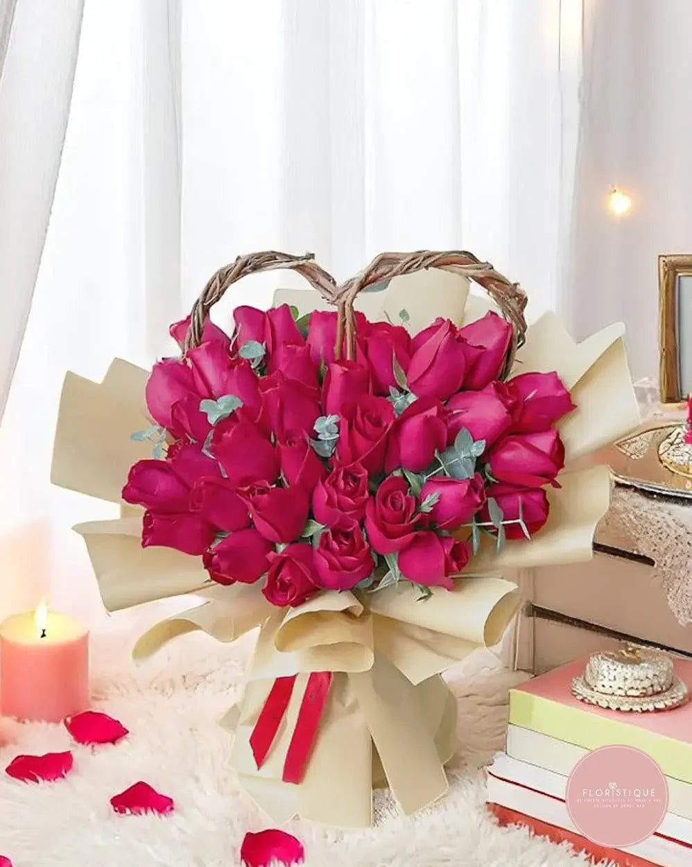 A breathtaking arrangement of premium red roses artfully set in a charming heart-shaped wicker basket. Each rose is hand-selected for its velvety petals and vibrant hue, accented with sprigs of silvery eucalyptus for a touch of modern elegance. Perfect for romantic gestures, anniversaries, Valentine’s Day, or simply to say “I love you” in the most memorable way.