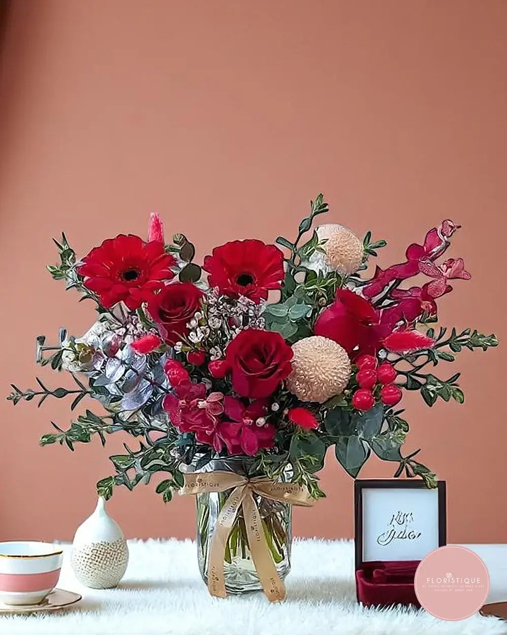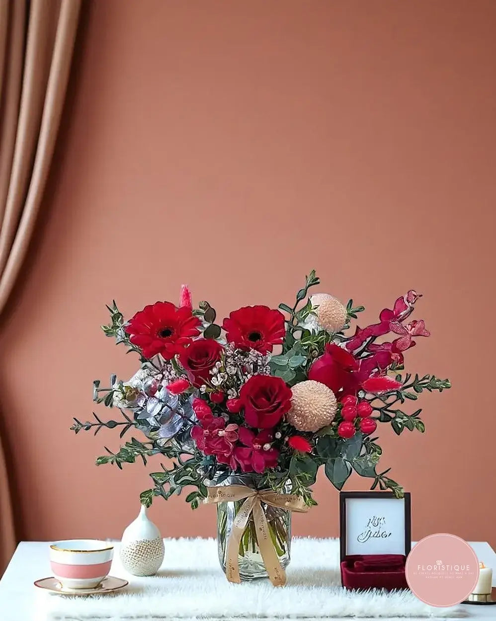 Perfect as a statement piece or thoughtful gift, this Ruby Radiance Vase Arrangement brings a burst of colour and sophistication to any home or office. Order now for reliable flower delivery Singapore-wide and same-day vase arrangement delivery Singapore!