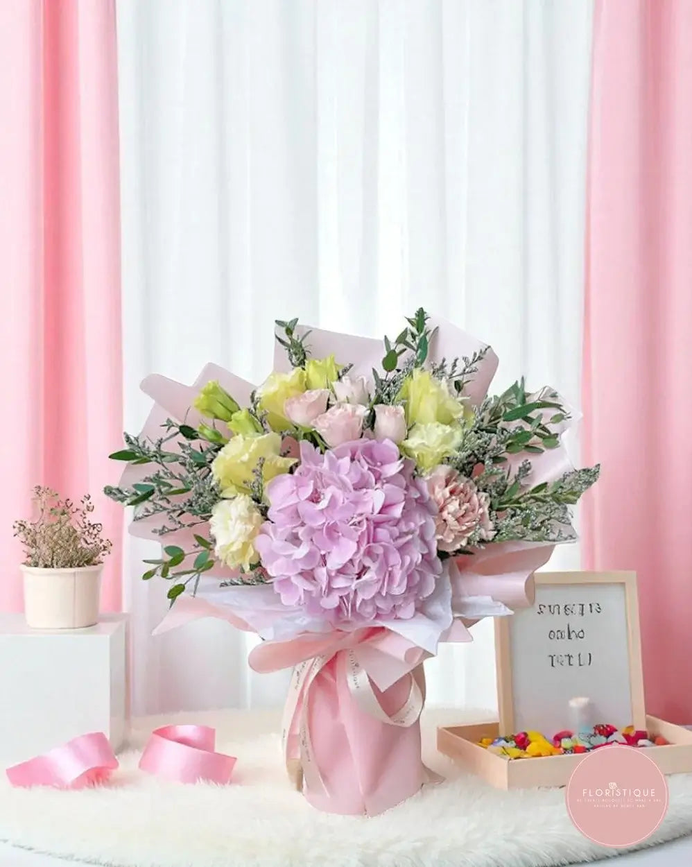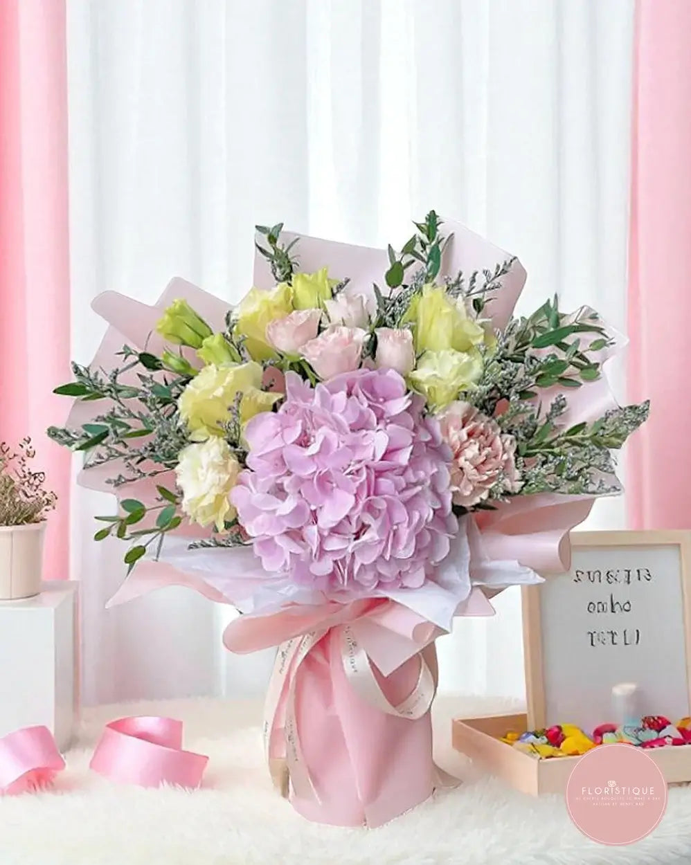 A cheerful celebration of colour and charm, this bouquet features a stunning pink hydrangea surrounded by soft yellow eustoma, blush carnations, and gentle greenery. Wrapped in layers of pastel pink and finished with satin ribbon, it’s an uplifting choice for birthdays, celebrations, or heartfelt surprises.