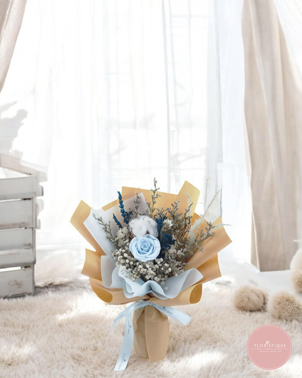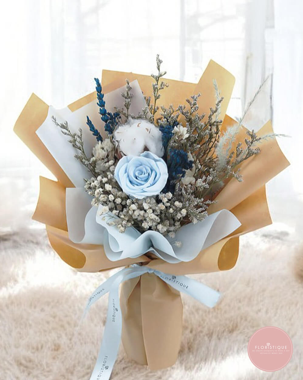 Cool blues meet cosy neutrals in this calming keepsake featuring a sky-blue preserved rose, cotton, misty greens and textured foliage, layered in clean kraft and white wraps. Elegant yet understated, it brings a gentle coastal vibe to bedside tables and work desks while requiring almost zero upkeep.