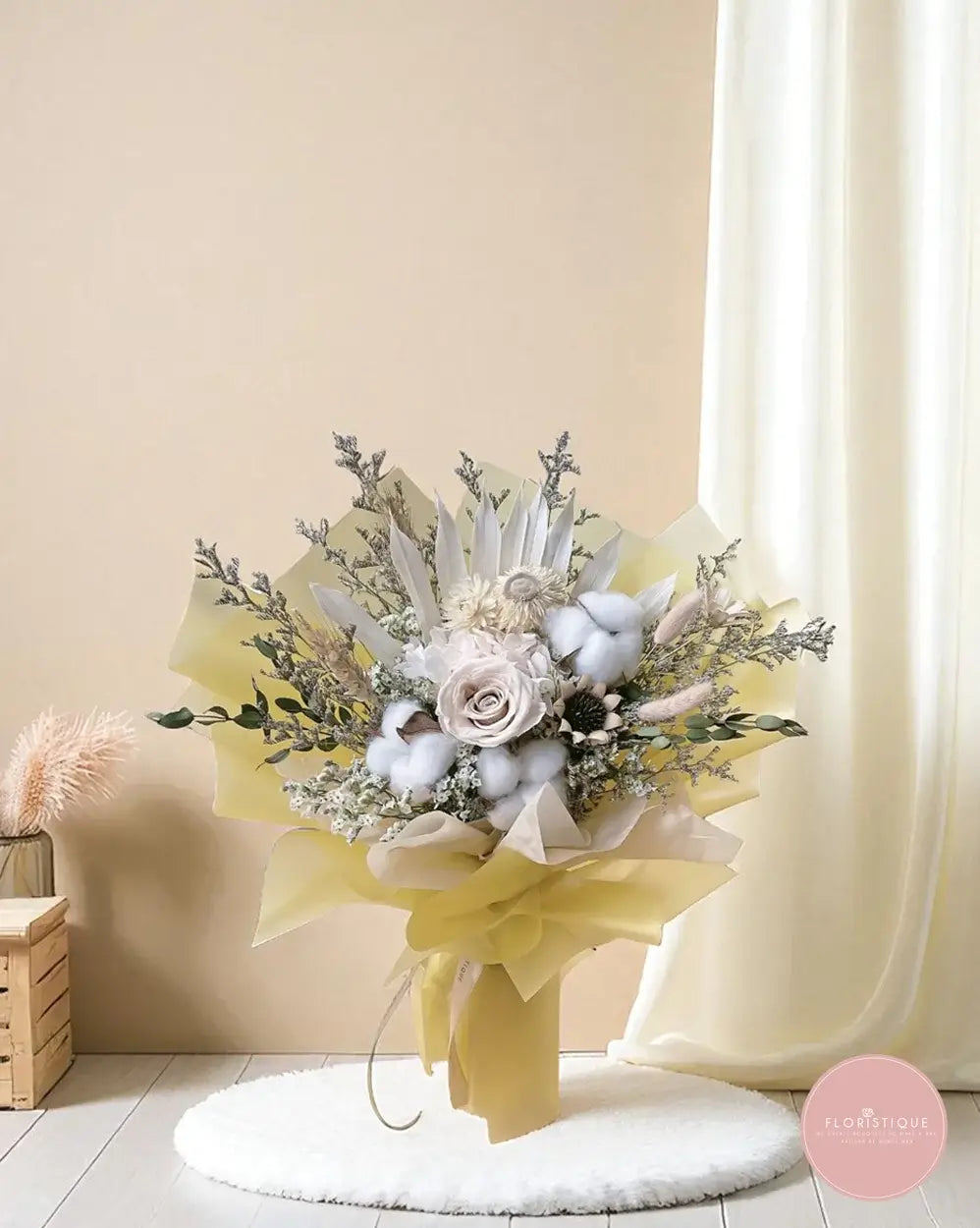 This elegant preserved flower bouquet features soft beige roses, fluffy white cotton, and dried elements like palm spears and rustic filler blooms. Wrapped in cheerful yellow, it radiates warmth and timeless charm, making it a striking gift that lasts.