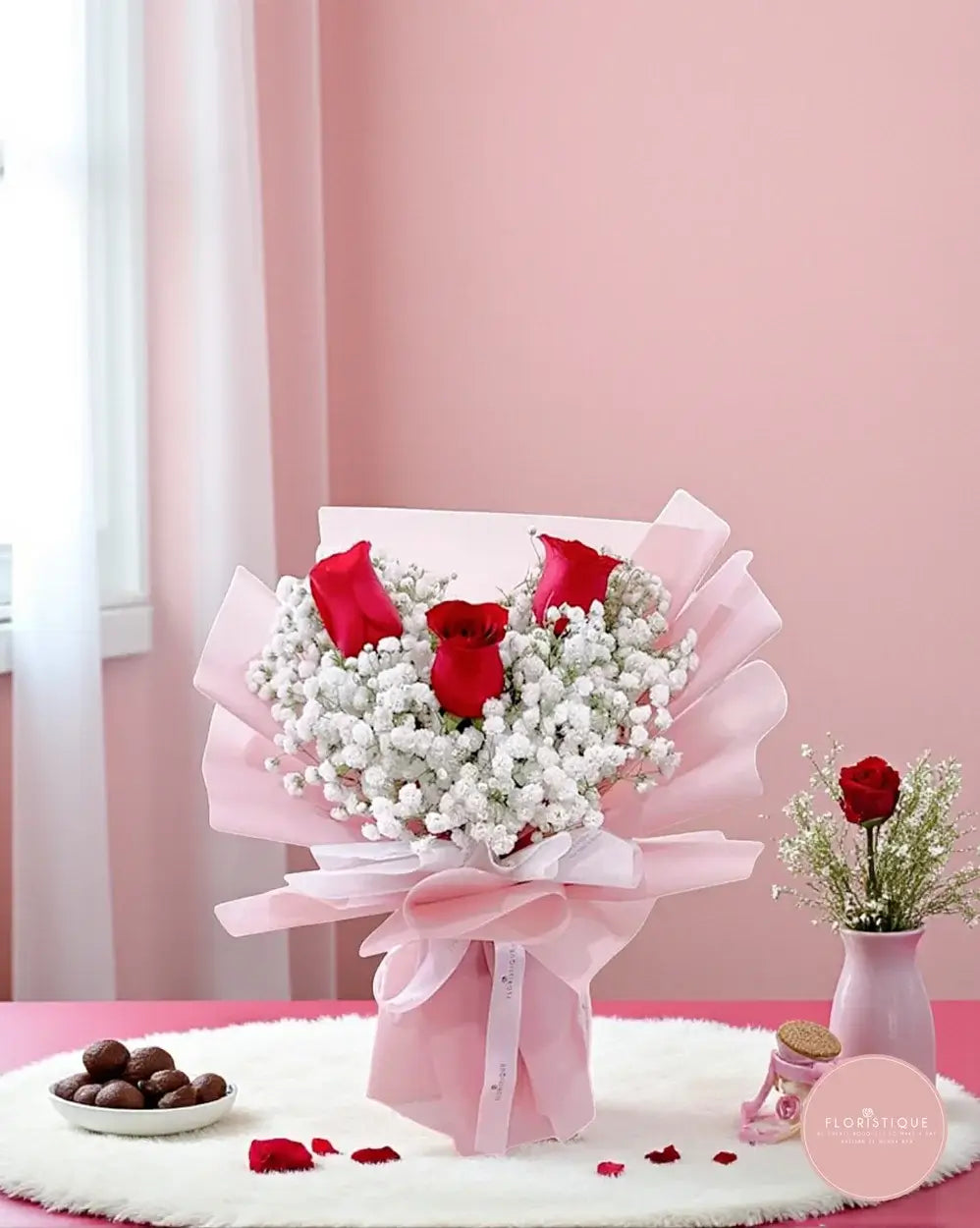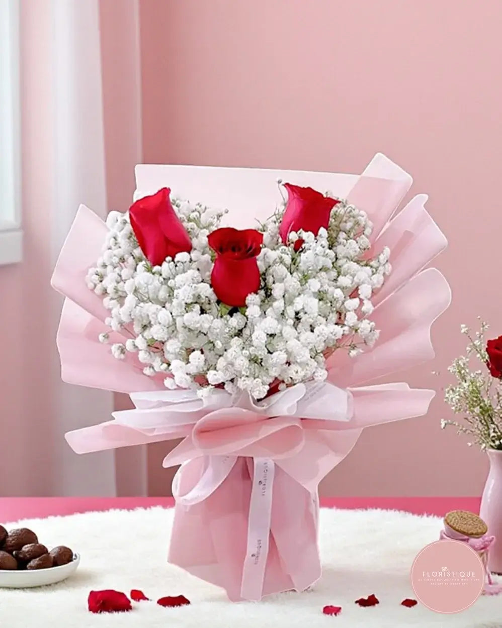 A tender expression of love, this bouquet features three bold red roses nestled in a heart-shaped arrangement of delicate white baby’s breath, wrapped in soft blush pink paper and tied with a romantic satin ribbon. Elegant yet heartfelt, it’s the perfect gesture for celebrating affection.