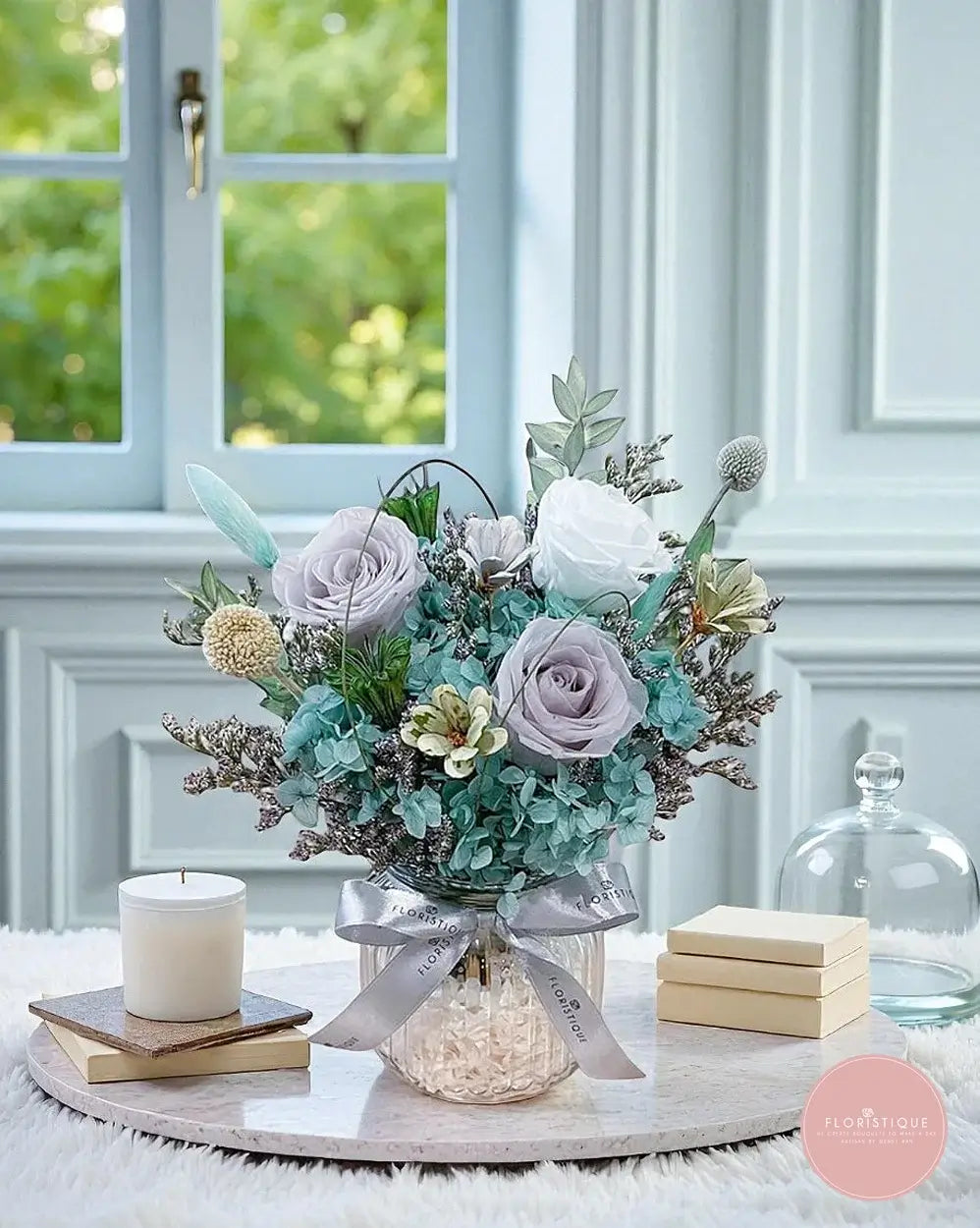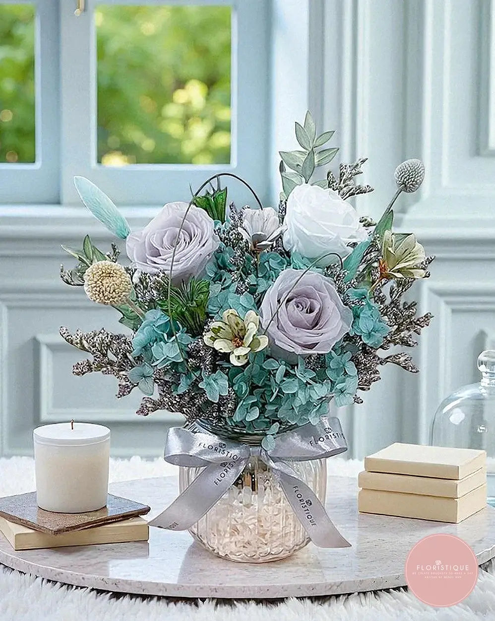 Cool and calming, this elegant keepsake blends icy lilac and white preserved roses with sea-foam hydrangea, silvery foliage and dainty meadow accents in a ribbed glass jar finished with a satin bow. Long-lasting and low-maintenance (no watering needed), it brings a refined, coastal touch to bedside tables, work desks and cosy corners—perfect for birthdays, housewarmings, anniversaries or a soothing “thinking of you.”