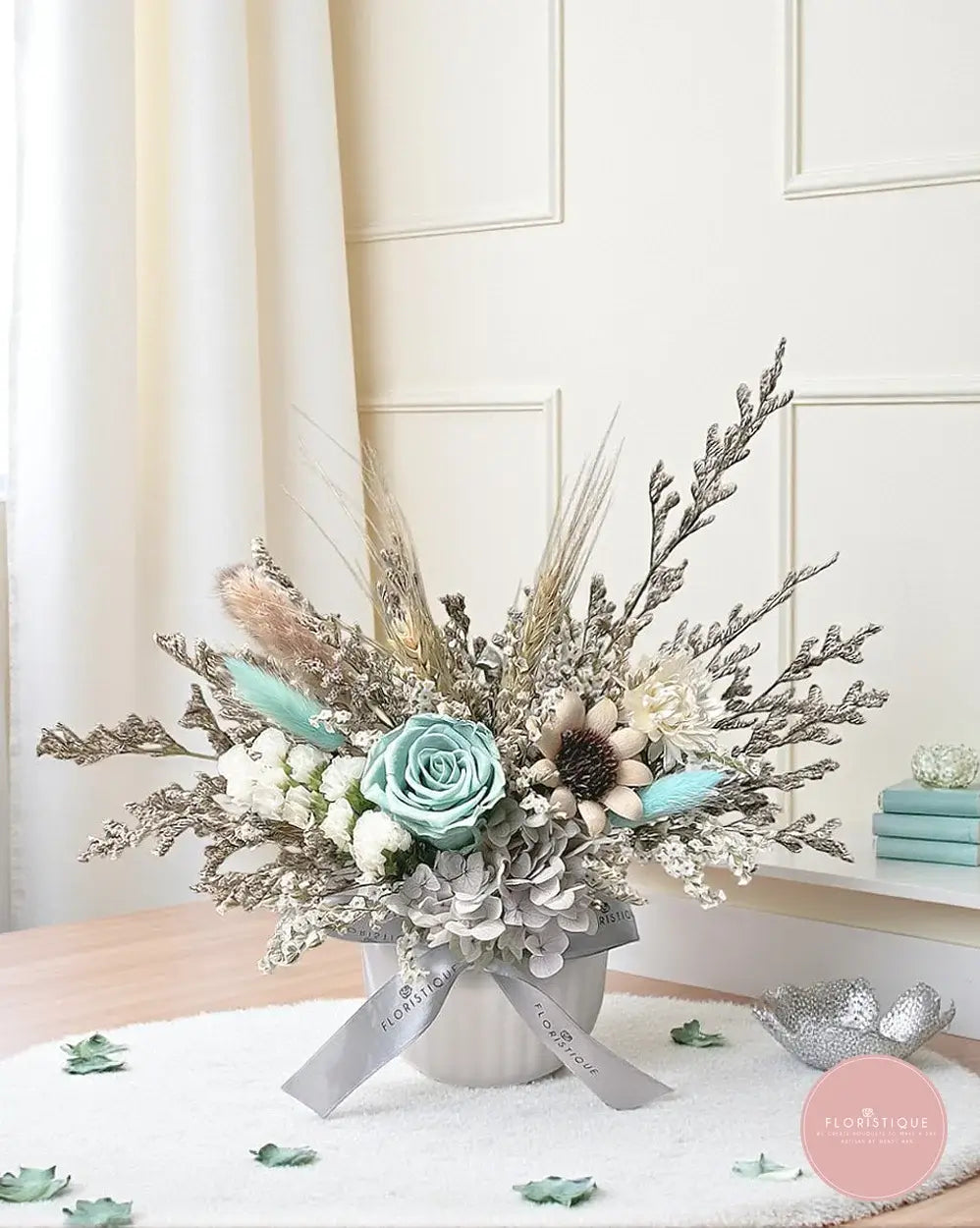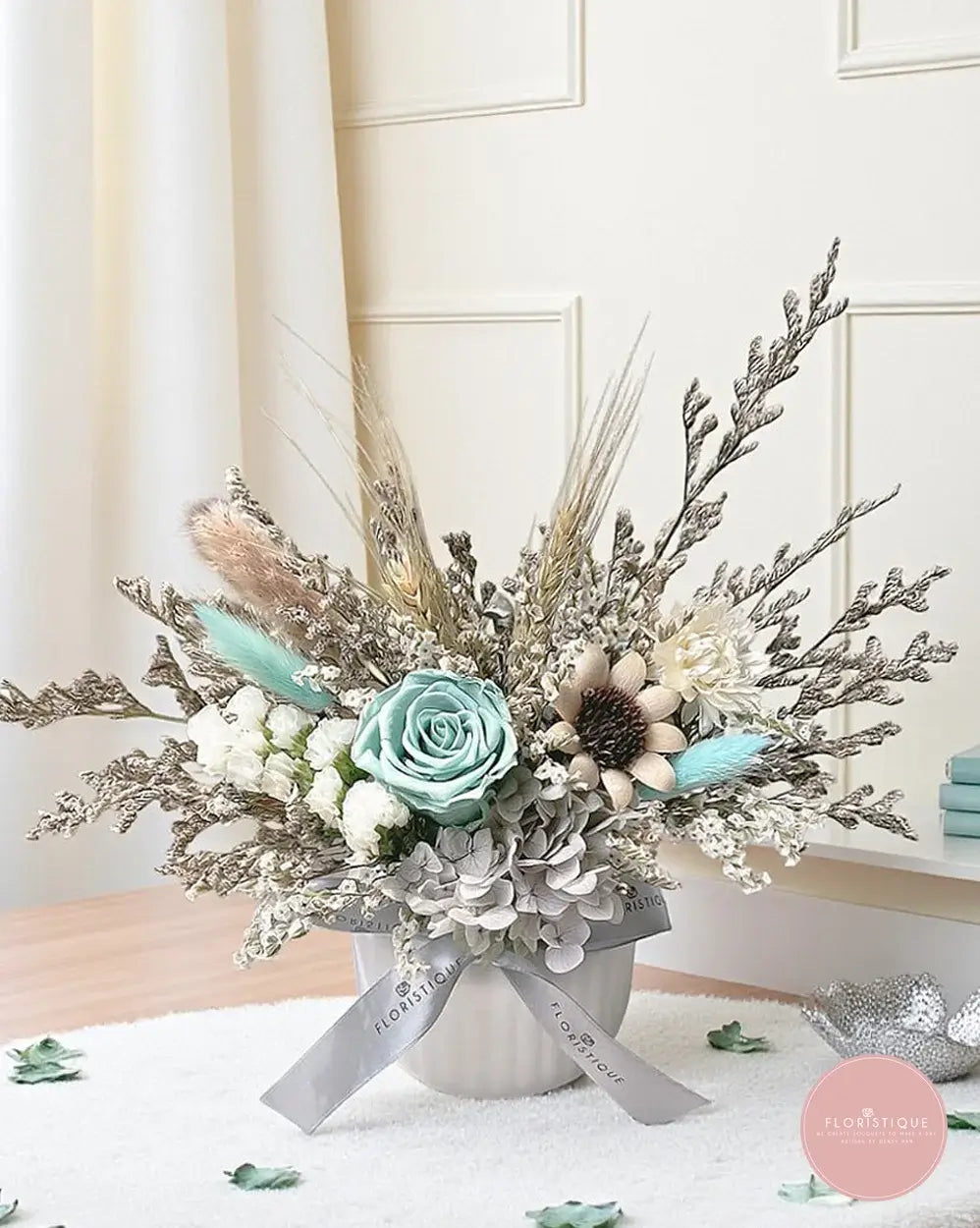 Unique and sophisticated, this preserved arrangement features a striking tiffany blue rose paired with hydrangea, cotton, dried fillers, and wheat accents. Presented in a modern white vase with a ribbon finish, it adds a refreshing touch of elegance to any space and makes a meaningful long-lasting gift.