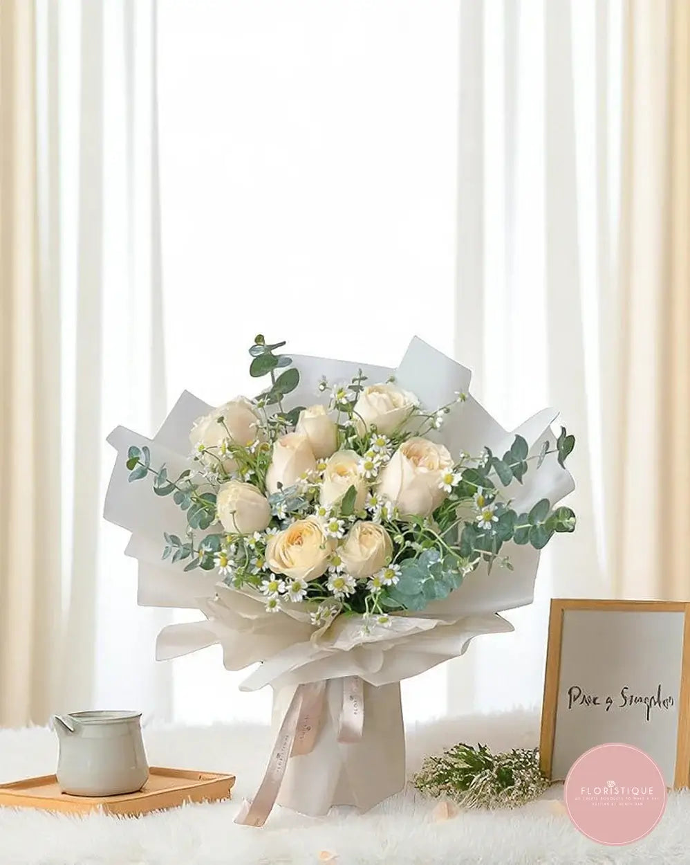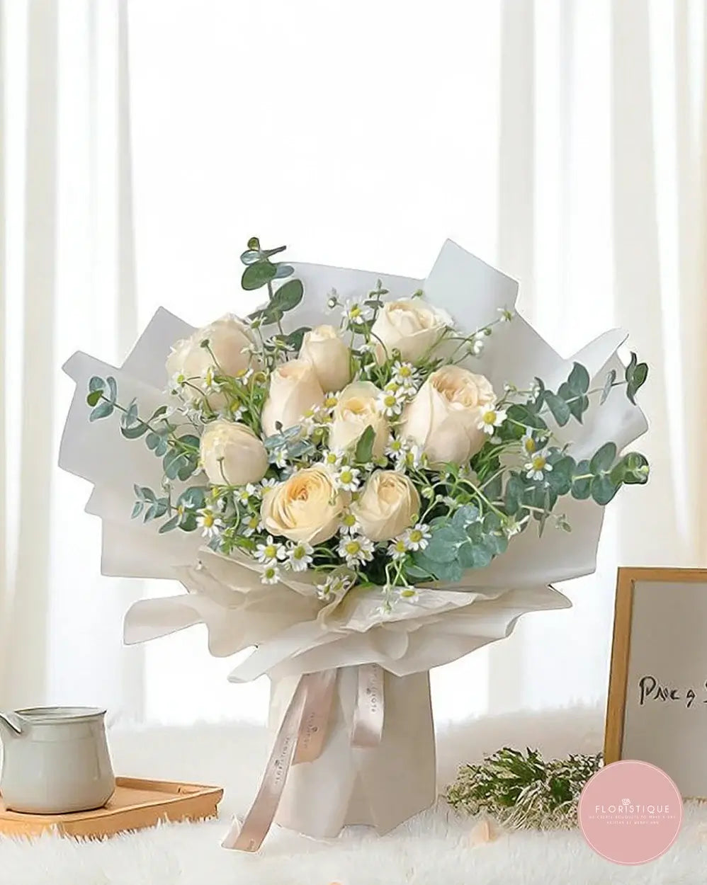 This refined bouquet features creamy ivory roses paired with cheerful chamomile blooms and fresh eucalyptus foliage, all beautifully wrapped in sheer white paper and finished with a soft satin ribbon. Understated yet timeless, it's a graceful gift perfect for birthdays, anniversaries, or simply to brighten someone’s day.