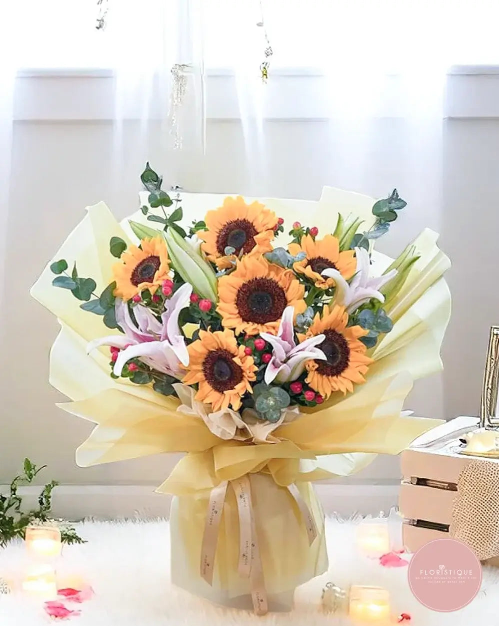 Bright and uplifting, this bouquet features a striking ensemble of golden sunflowers, delicate pink lilies, vibrant hypericum berries, and lush eucalyptus — all wrapped in warm yellow tones and finished with soft satin ribbon. A cheerful gift that captures joy, positivity, and heartfelt warmth.