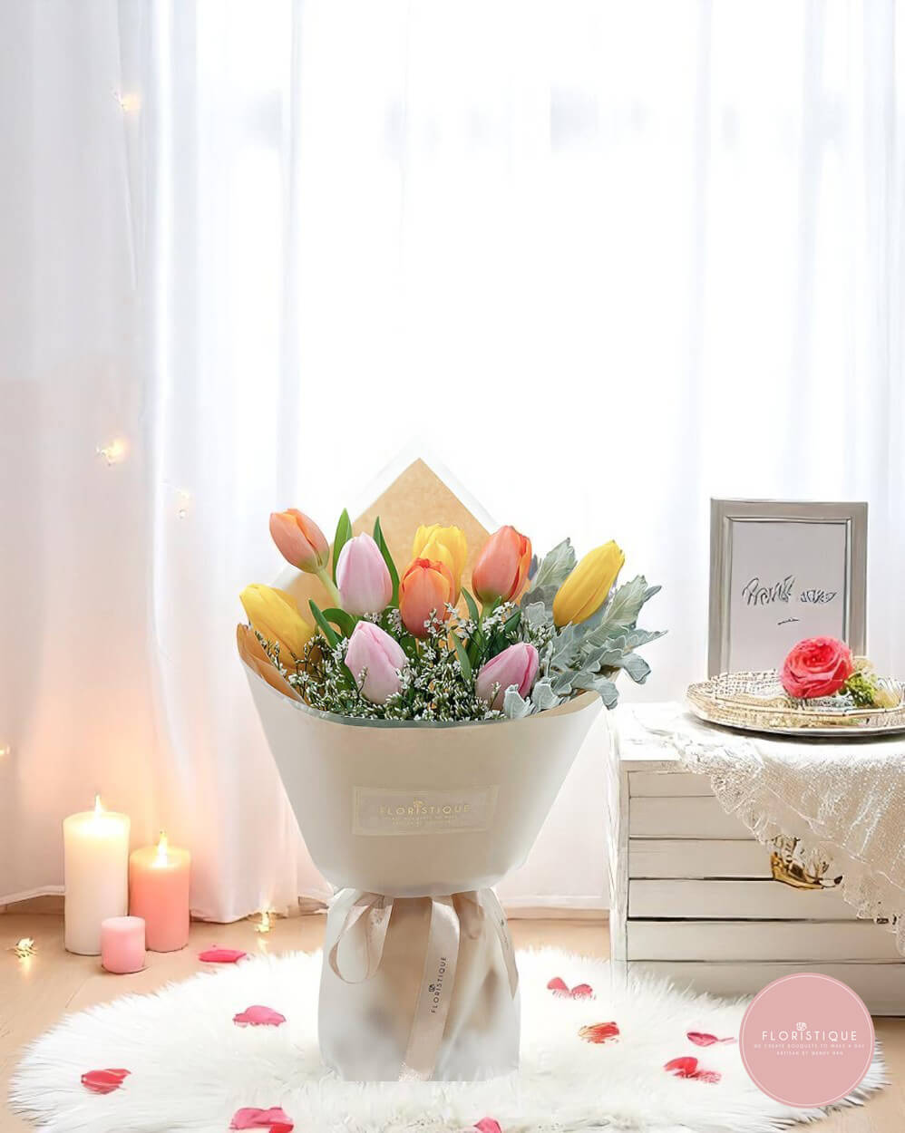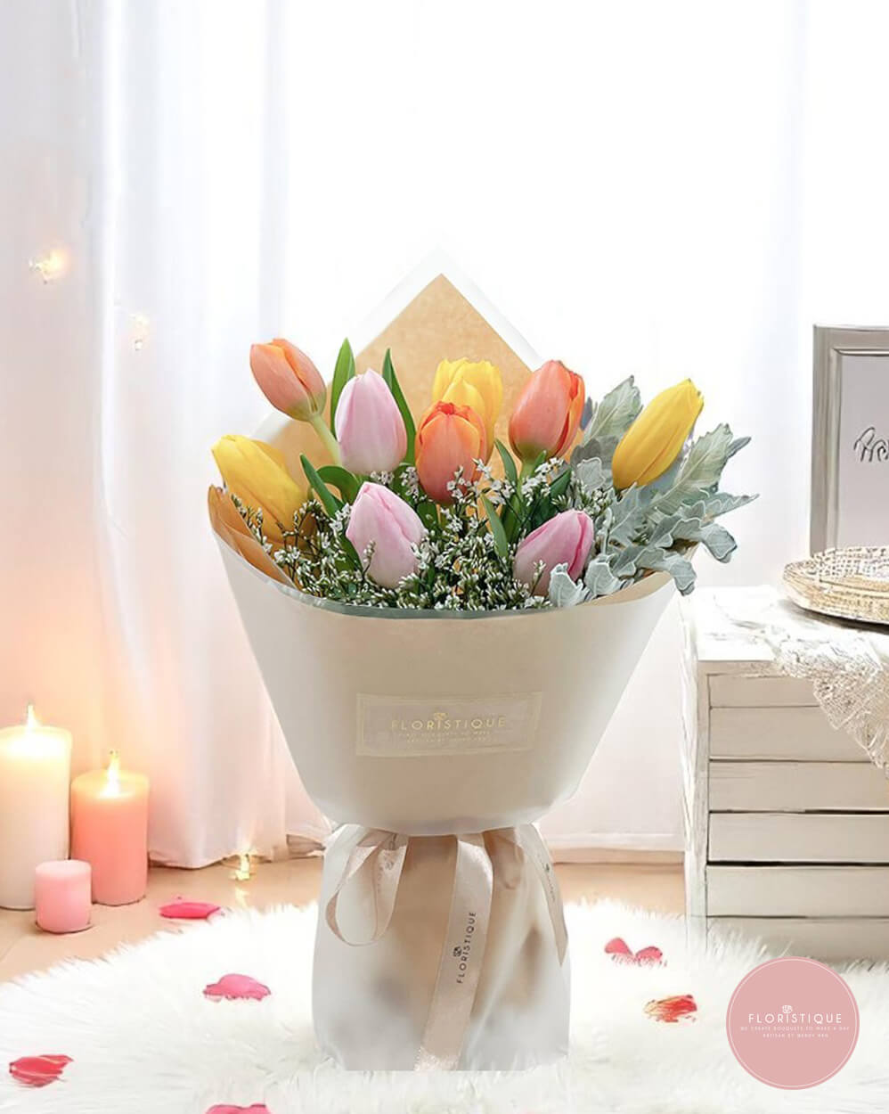 A delightful burst of colour, this bouquet features a graceful medley of fresh tulips in soft pink, vibrant yellow, and peachy orange tones. Accented with delicate baby’s breath and silvery foliage, it's elegantly wrapped in creamy white paper and finished with satin ribbon.