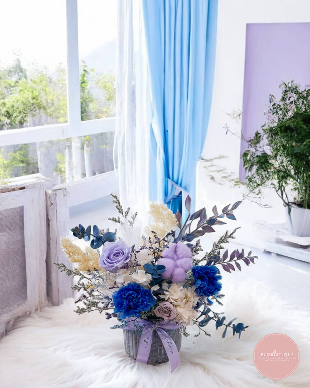 This enchanting arrangement showcases lavender roses, deep blue carnations, and creamy hydrangeas, accented with preserved foliage, feathery pampas, and fluffy cotton. Housed in a textured glass jar and finished with a soft lilac ribbon, it exudes elegance with a whimsical, fairytale-like touch.