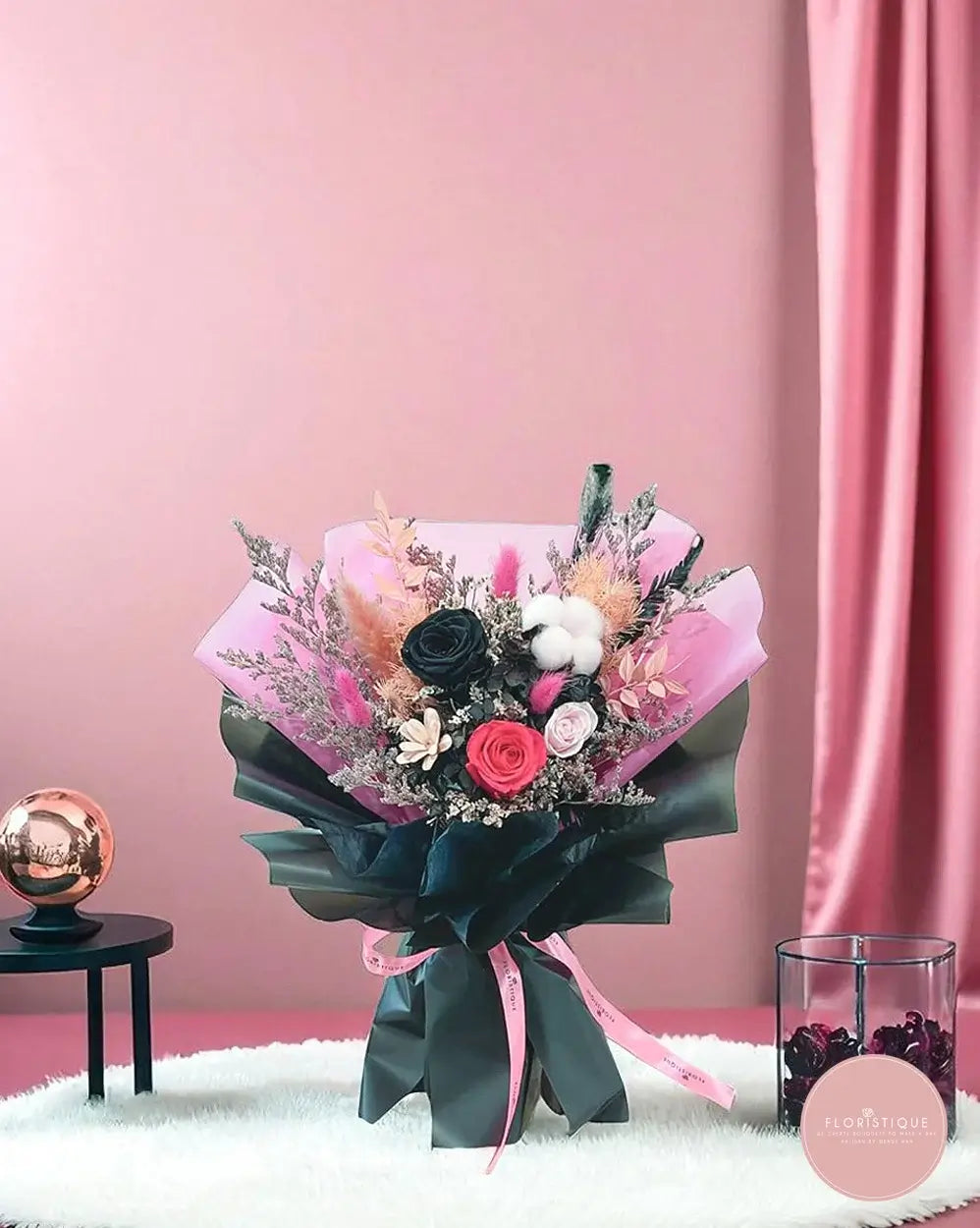 Perfect for anniversaries, romantic surprises, or unconventional gifting. Frequently searched under preserved flowers Singapore, everlasting flower bouquet, and romantic dried flower arrangement.