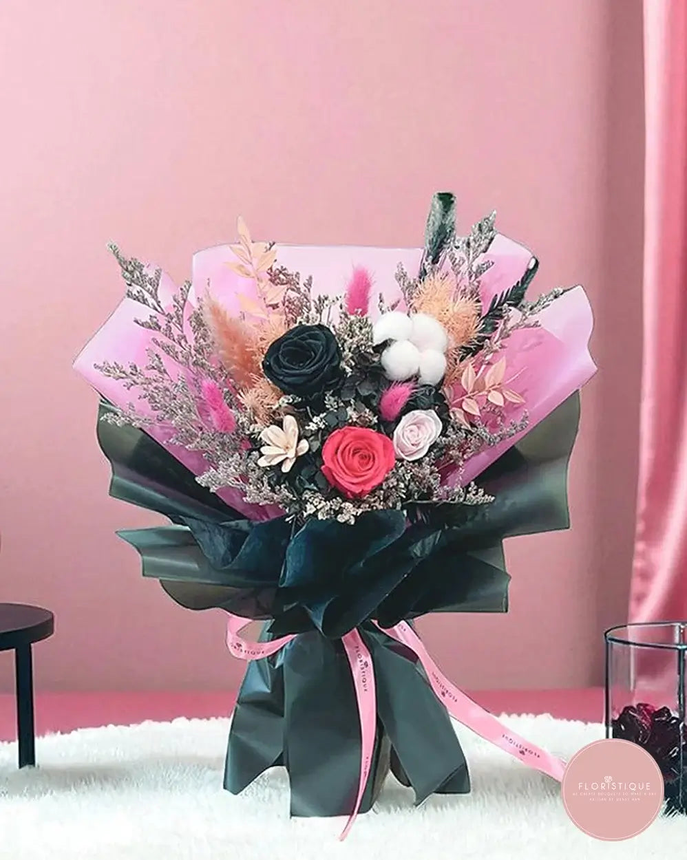 A bold composition of preserved black and red roses, offset by soft cotton blooms, blush-toned fillers, and rustic dried foliage. Wrapped in dramatic black and fuchsia paper, this bouquet is a striking gift that blends elegance with passion.