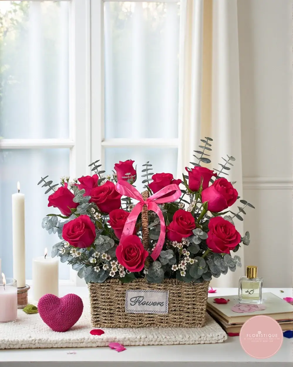 This charming basket arrangement features a lush gathering of velvety fuchsia roses nestled among silvery eucalyptus and dainty white blooms, all presented in a rustic woven basket and finished with a pretty pink ribbon bow. The mix of vibrant colour and cosy textures gives it a warm, romantic feel that looks beautiful on a dining table, console or office counter.