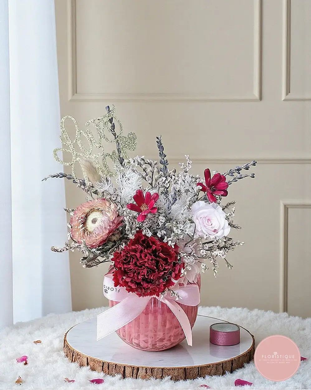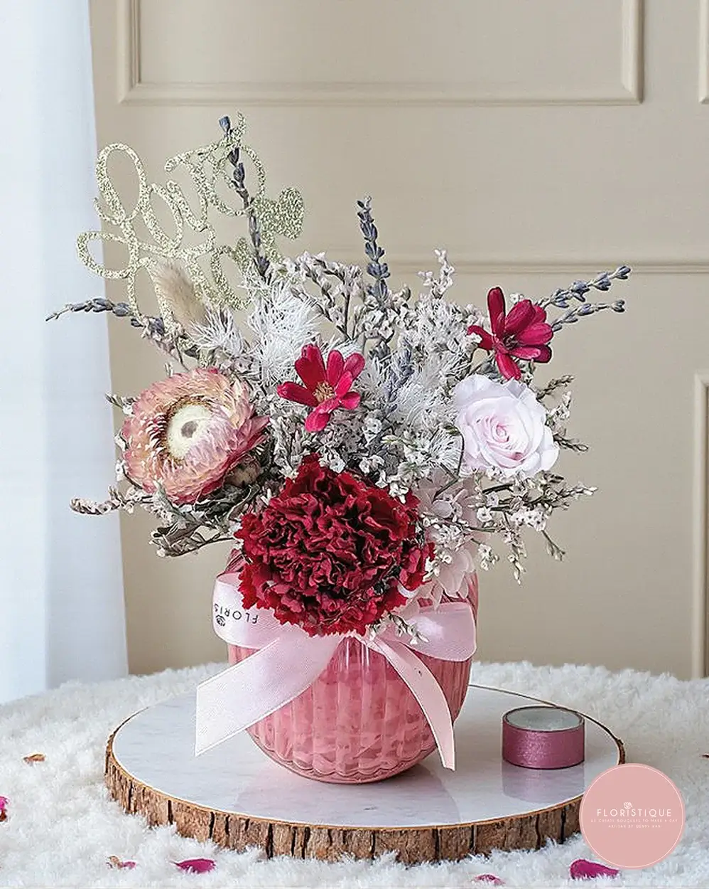 A charming keepsake in romantic crimson and blush, featuring preserved carnation, strawflower, rose and airy meadow fillers arranged in a textured pink vase with a satin bow. Long-lasting and low-maintenance, this preserved flower arrangement brings cosy elegance to desks and bedside tables—perfect for birthdays, anniversaries, Mother’s Day or simply to say “love you.” Curated by our online florist in Singapore, it stays beautiful for months with just a cool, dry spot away from direct sun.