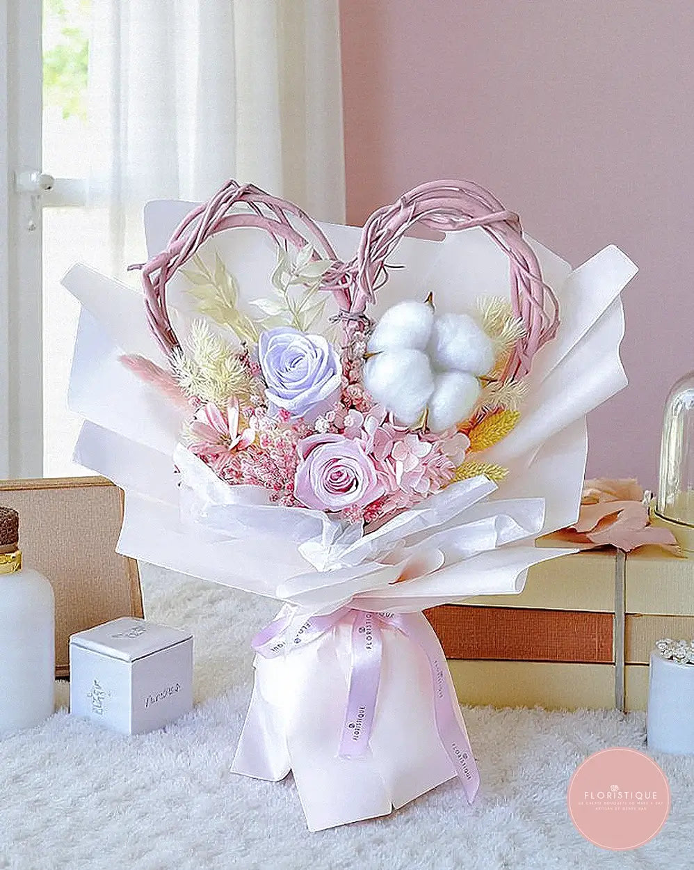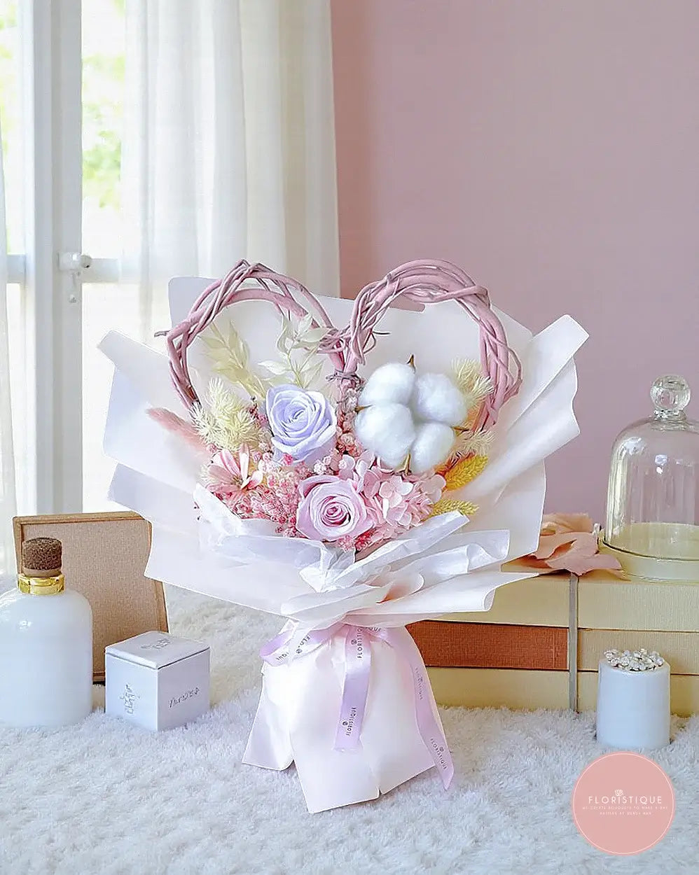A romantic keepsake featuring blush and lilac preserved roses, fluffy cotton, hydrangea accents and airy fillers, framed by a hand-twined rattan heart. This pastel beauty blends soft textures and dreamy hues for a sweet, photo-ready finish—perfect for proposals, anniversaries, birthdays or simply to say “I adore you.” Crafted with long-lasting preserved florals, it stays lovely for months with minimal care, making it a thoughtful, sustainable gift from our online florist in Singapore.