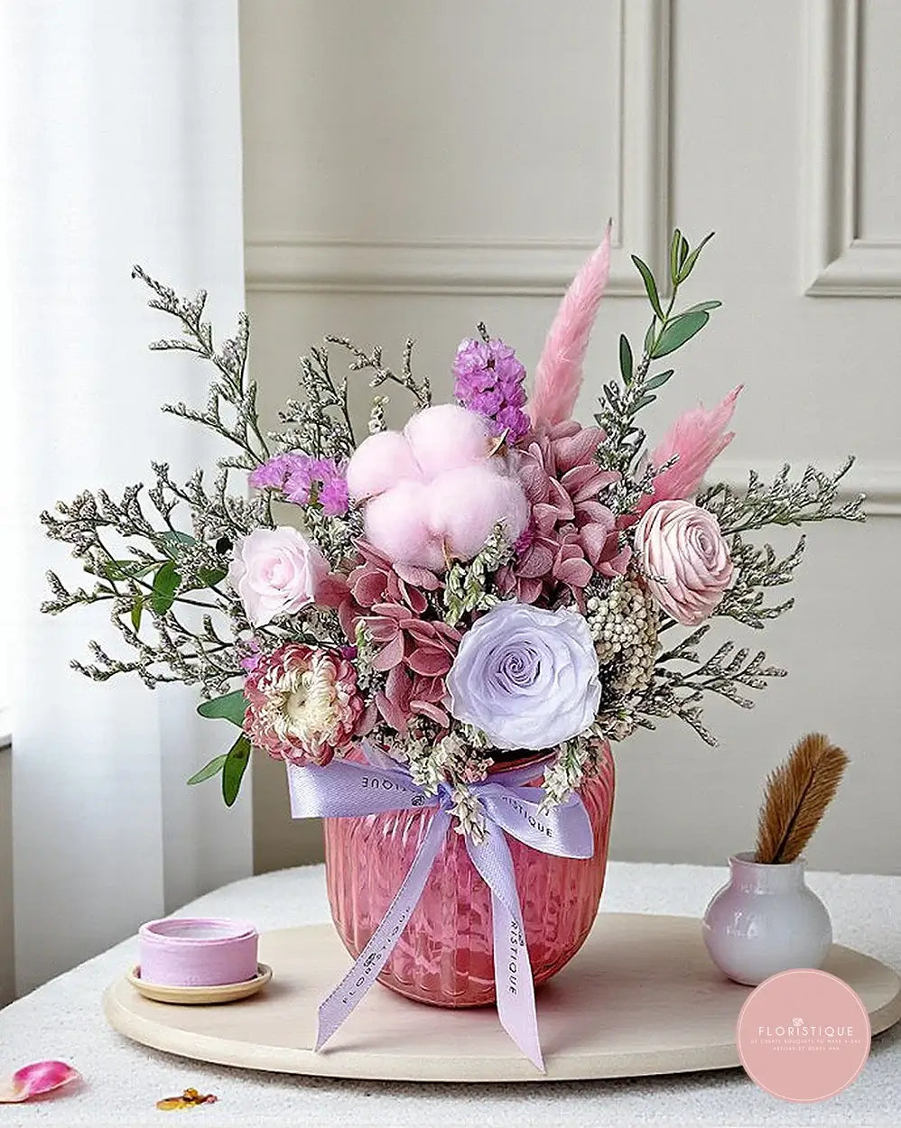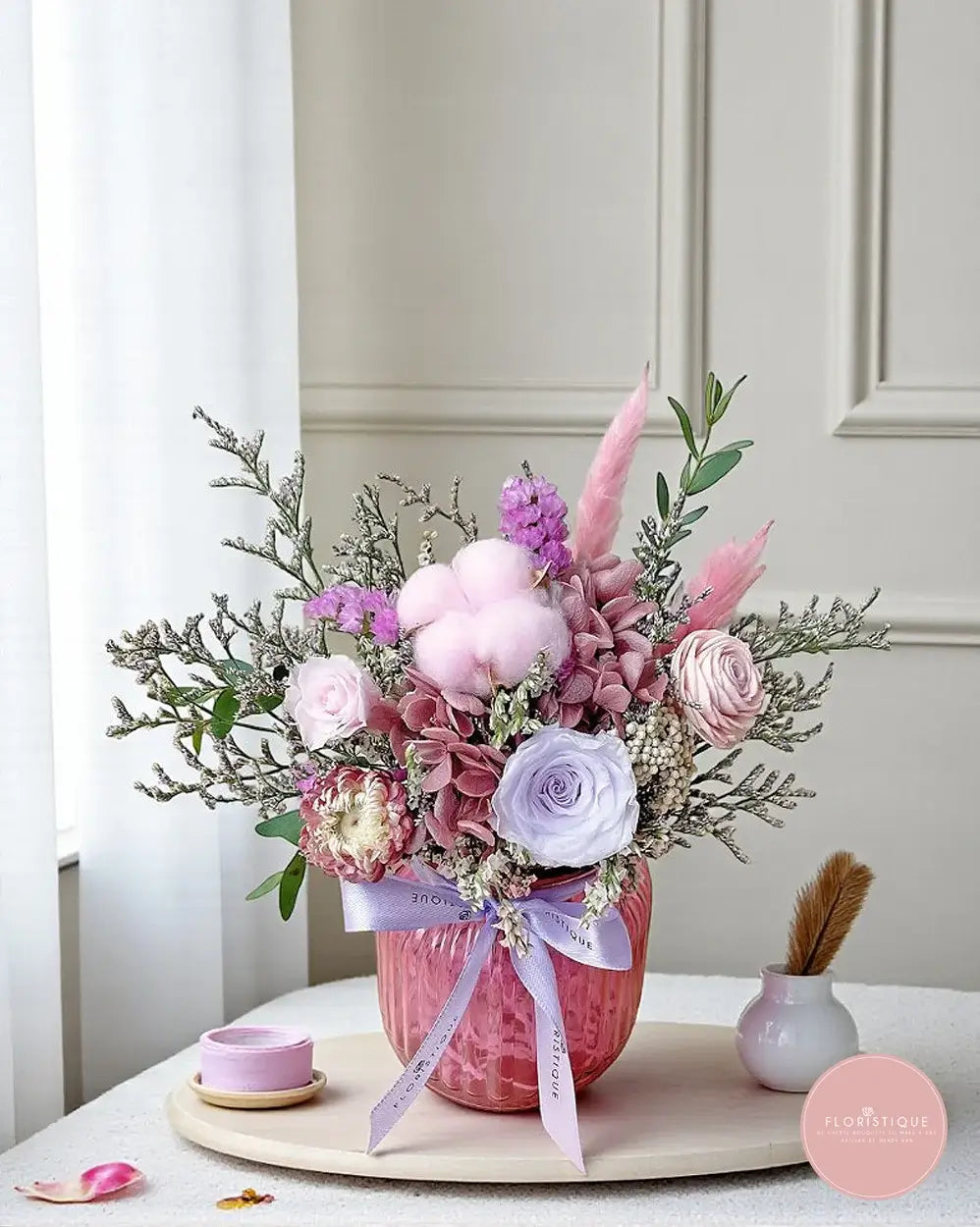 A sweet keepsake in blush and lilac featuring preserved roses, hydrangea, strawflower and airy fillers, topped with fluffy pink cotton and soft bunny tails in a textured pink vase. Long-lasting and low-maintenance, this preserved flower arrangement brings cosy elegance to desks, shelves and bedside corners—perfect for birthdays, anniversaries, housewarmings or a heartfelt “thinking of you.” Curated by our online florist in Singapore, it stays beautiful for months with simple care (keep cool and dry, no watering).