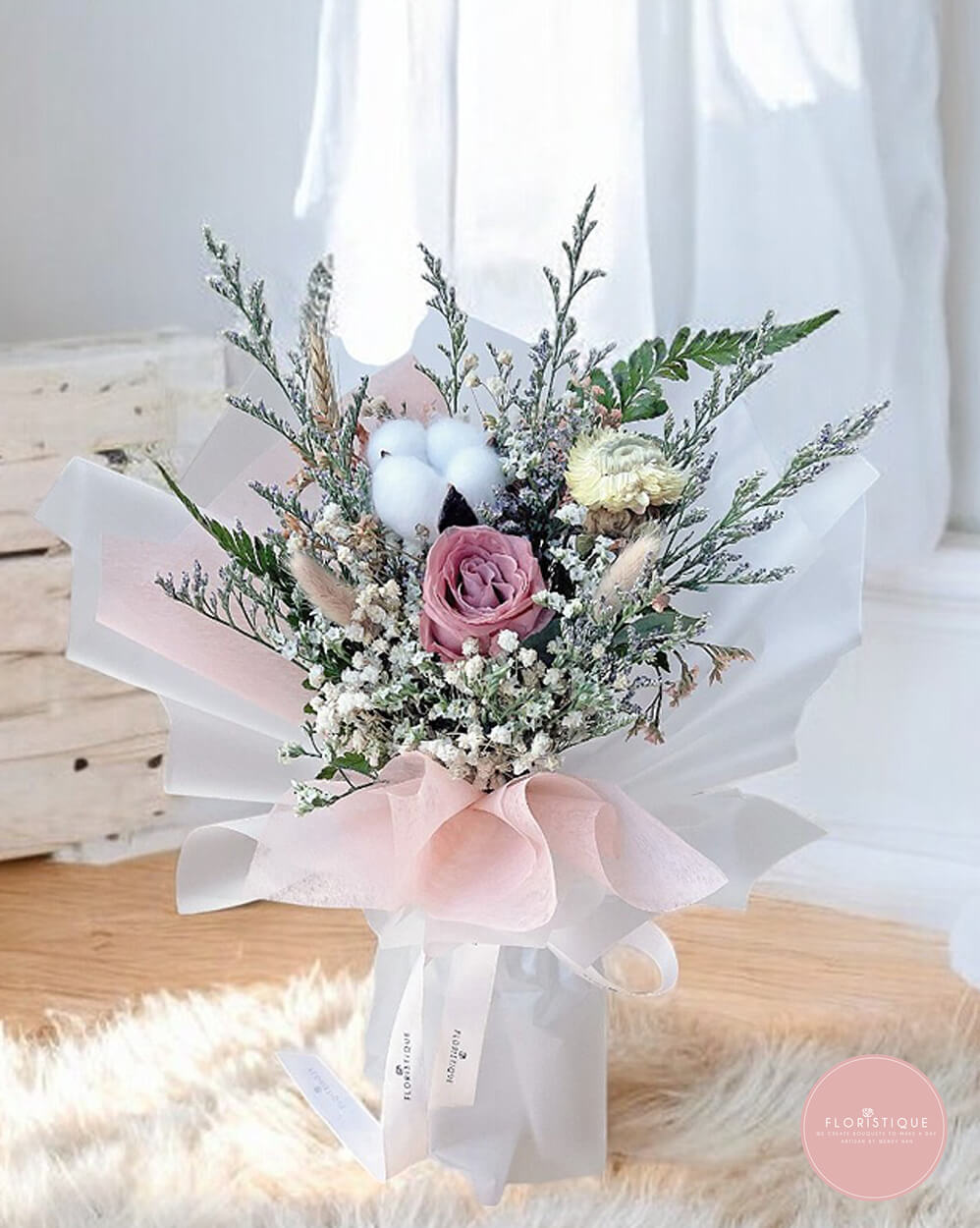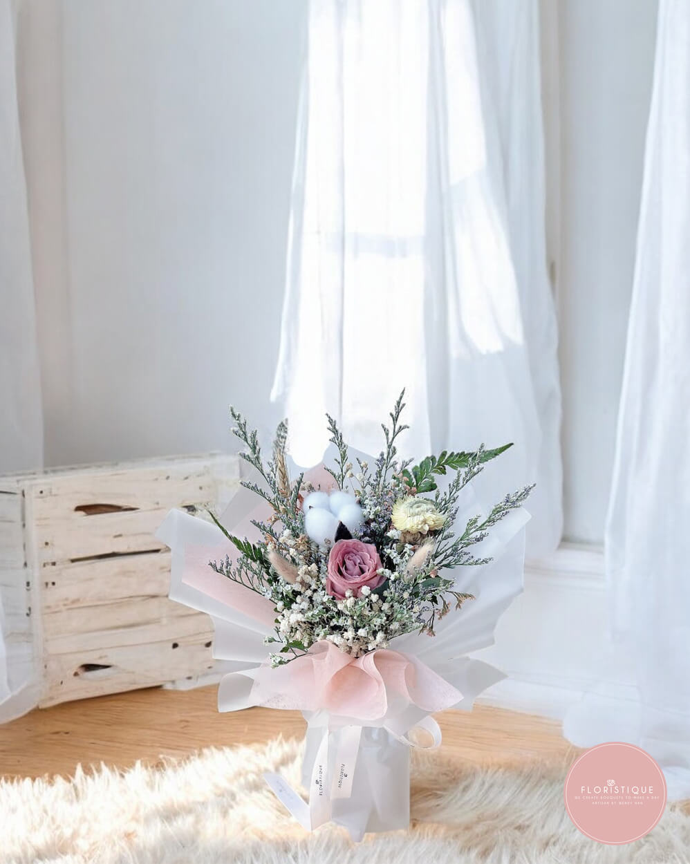 Handcrafted by our online florist in Singapore, it arrives photo-ready with free same-day flower delivery Singapore-wide. Shop preserved flower bouquet Singapore at Floristique for elegant, lasting gifts.