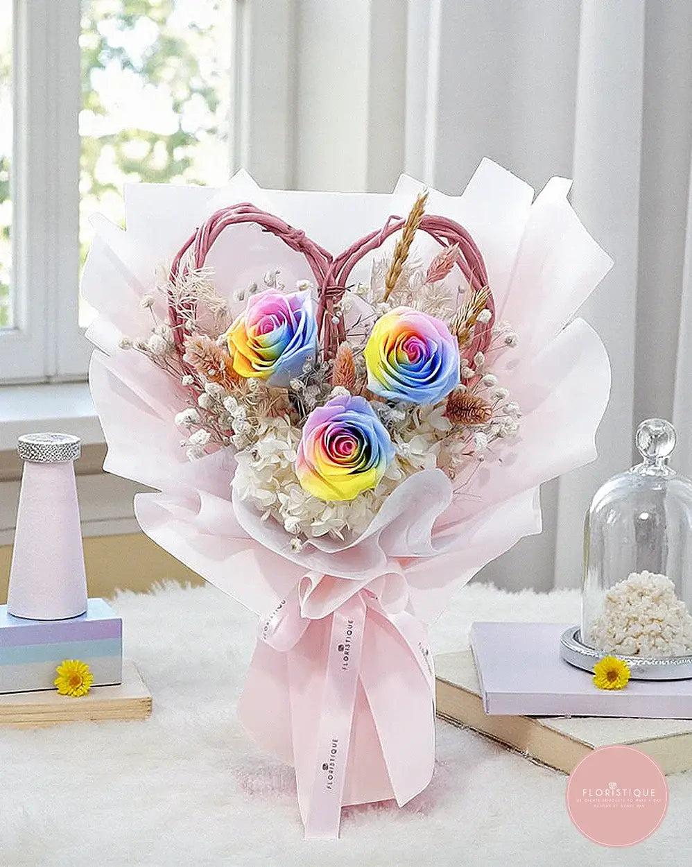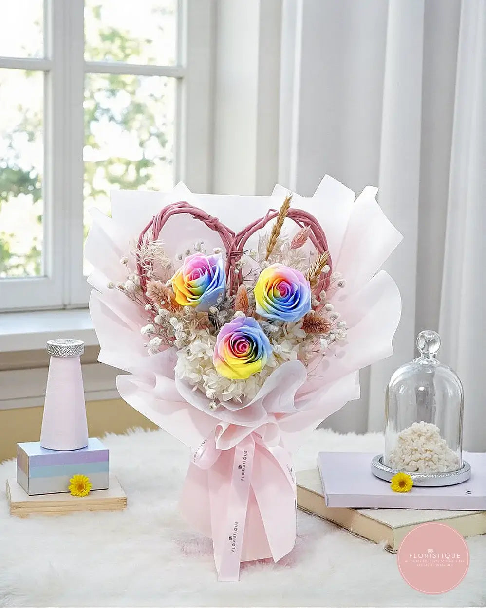 Send joy that lasts with free same-day flower delivery in Singapore. Order this rainbow roses preserved flower bouquet from Floristique—your trusted florist Singapore.