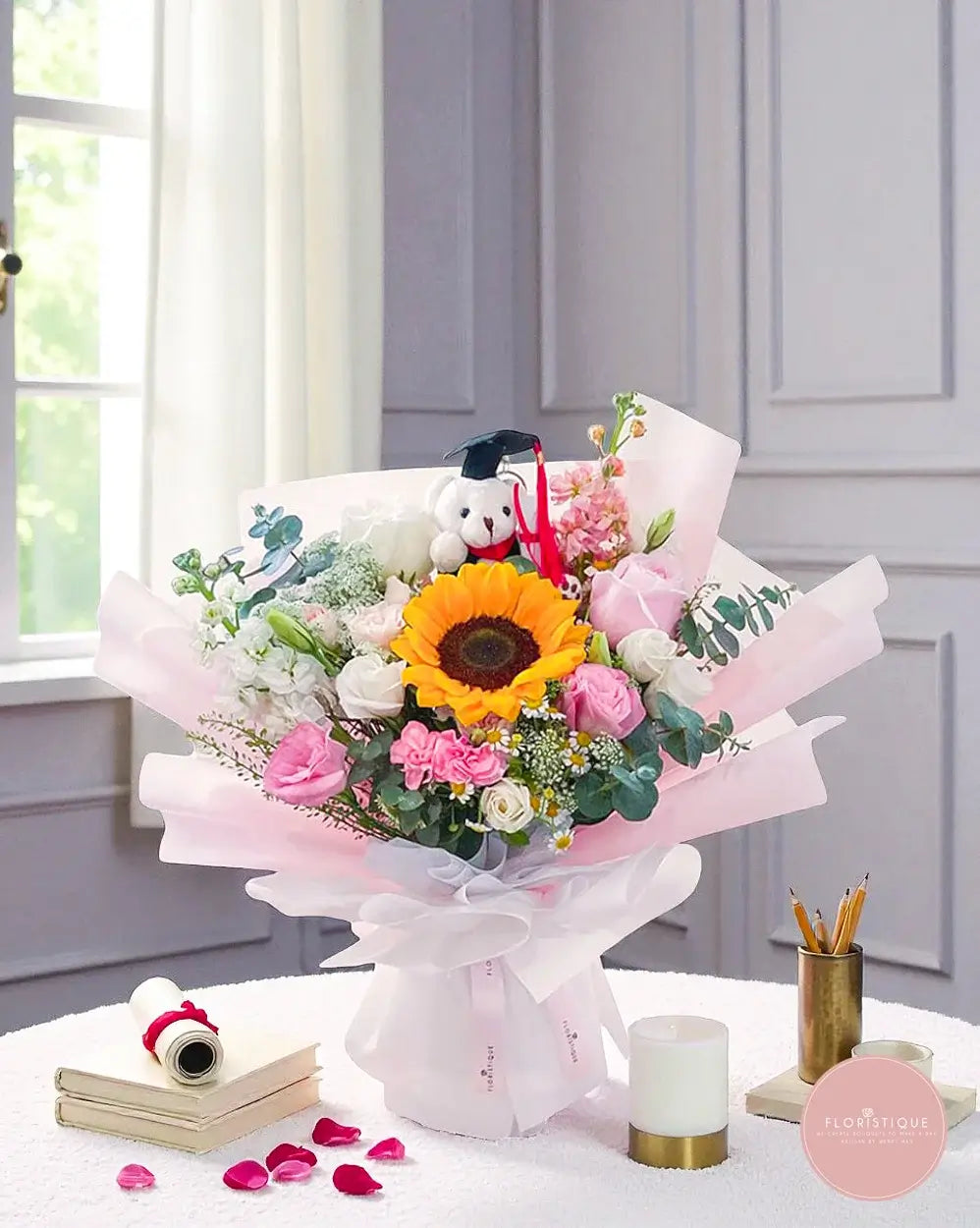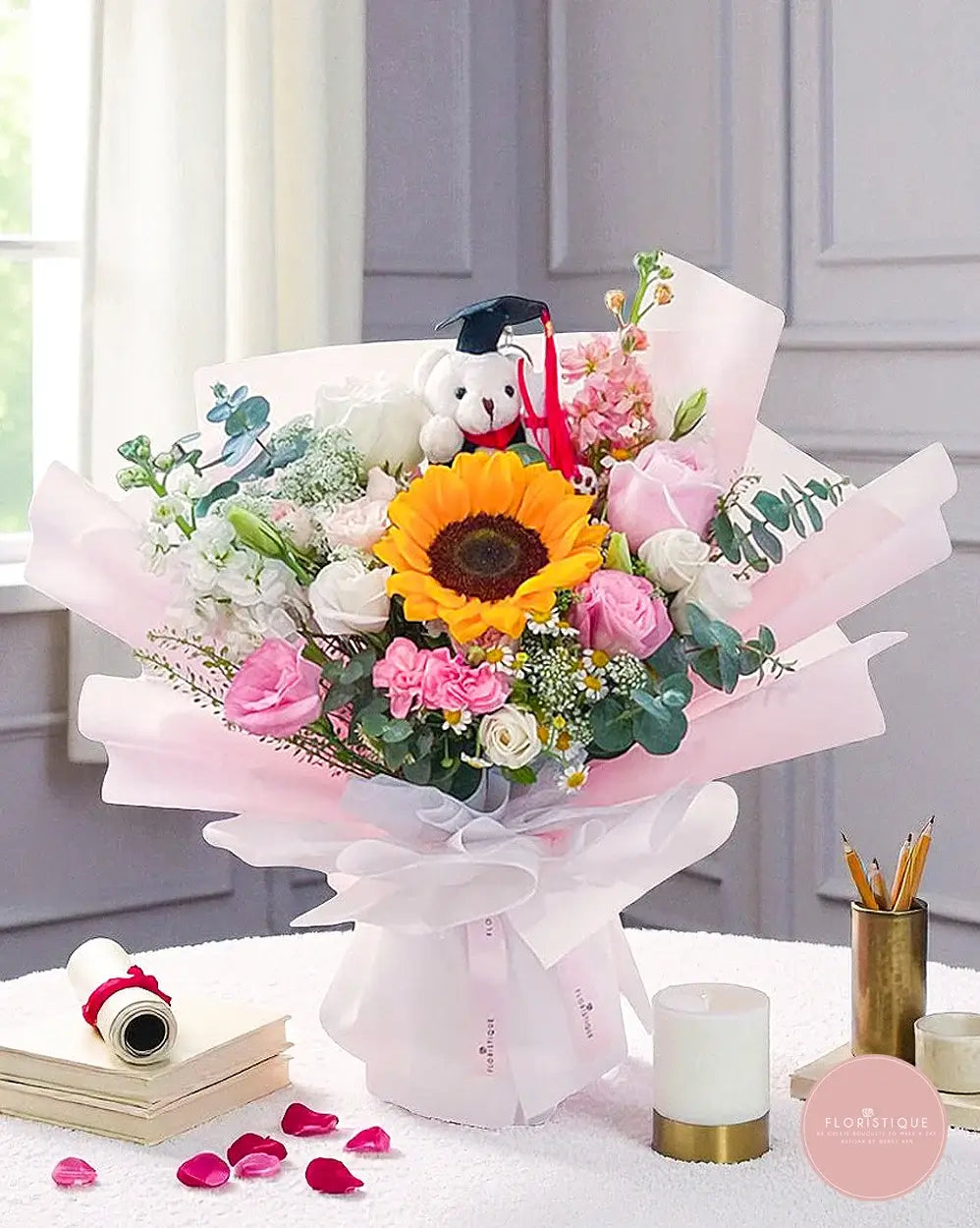 Thoughtfully designed by Floristique, your trusted online florist in Singapore, this bouquet comes with free same-day flower delivery — ideal for graduations, ceremonies, or a surprise school send-off.