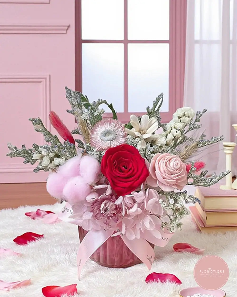 Romantic and lasting, this preserved arrangement features a bold red rose paired with blush pink cotton, hydrangea, and dried fillers. Presented in a chic vase with a satin ribbon, it adds timeless elegance to any space while serving as a meaningful keepsake gift.