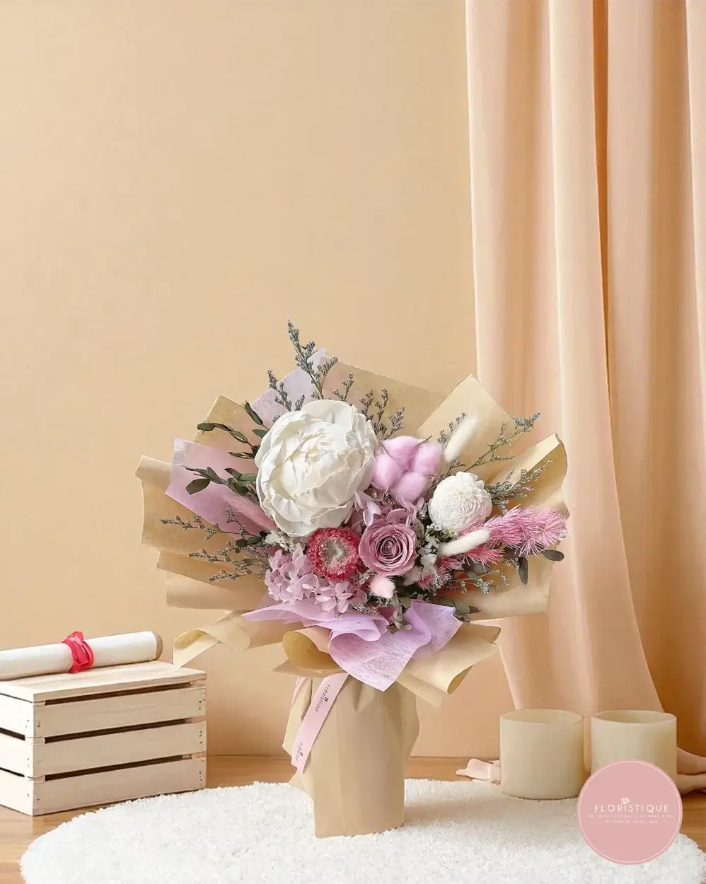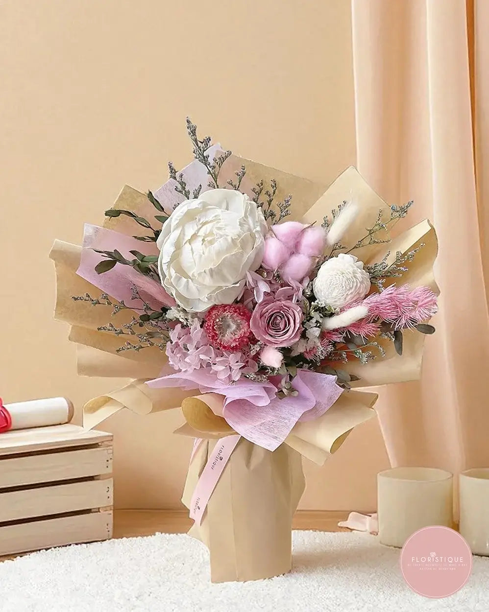 Perfect for anniversaries, congratulations, or everlasting gestures of love. Ideal for those searching florist Singapore, preserved flower delivery, or elegant dried flower arrangements.
