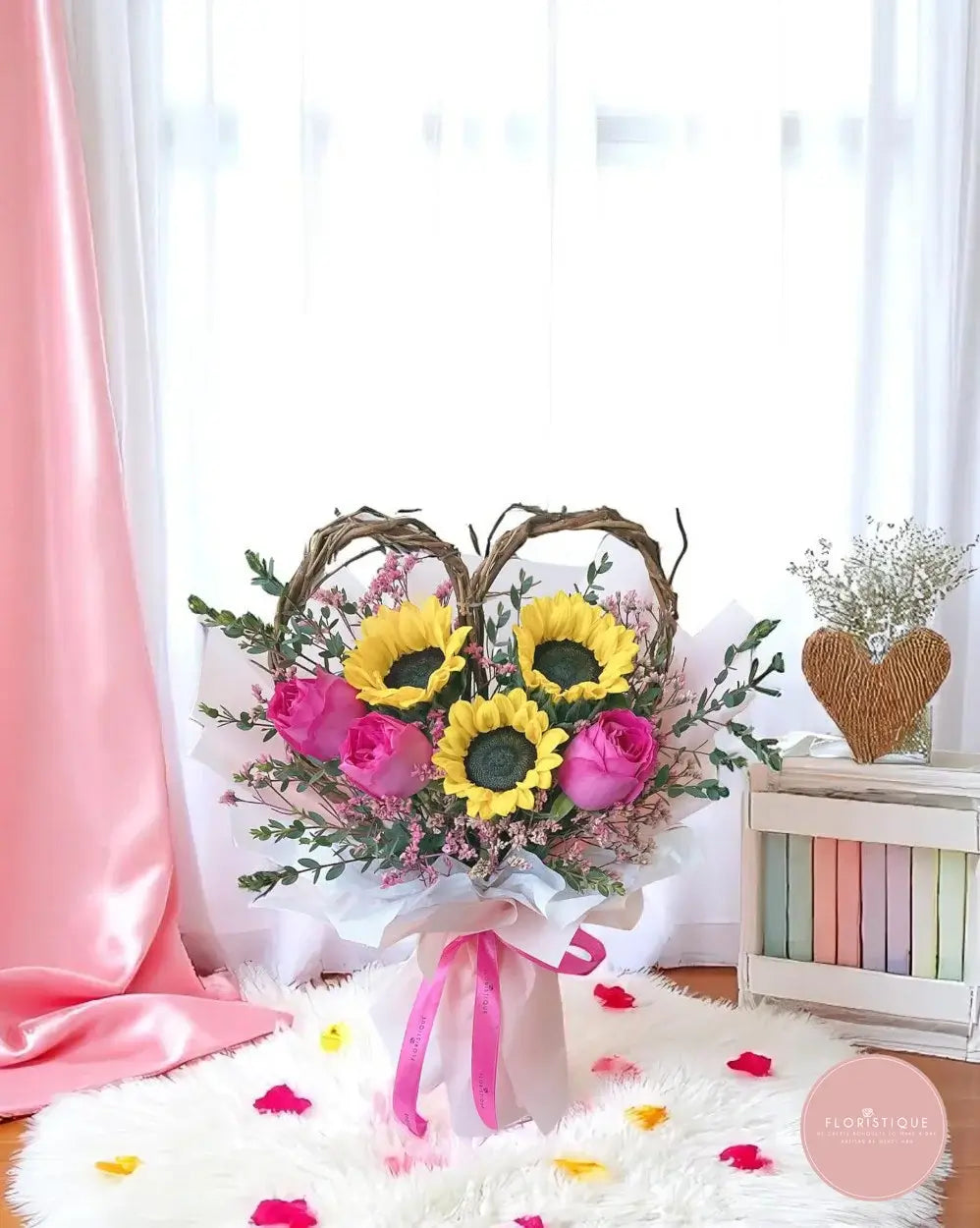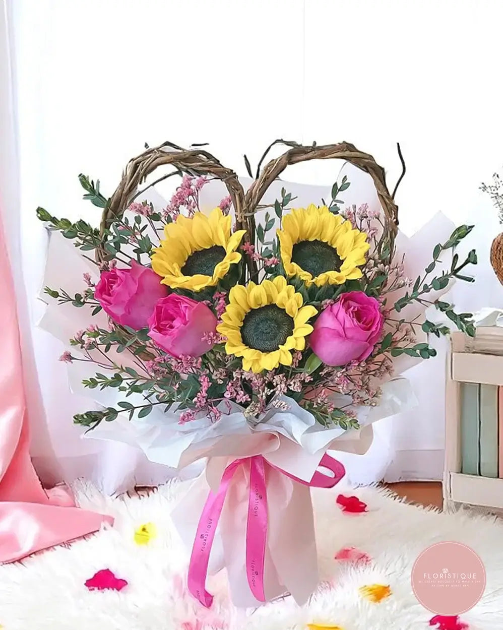 A vibrant mix of golden sunflowers and hot pink roses, accented with dainty fillers and framed by twin heart-shaped vines. Wrapped in soft pastel pink, this cheerful bouquet is perfect for celebrations, romantic surprises, or to send joyful wishes from the heart.
