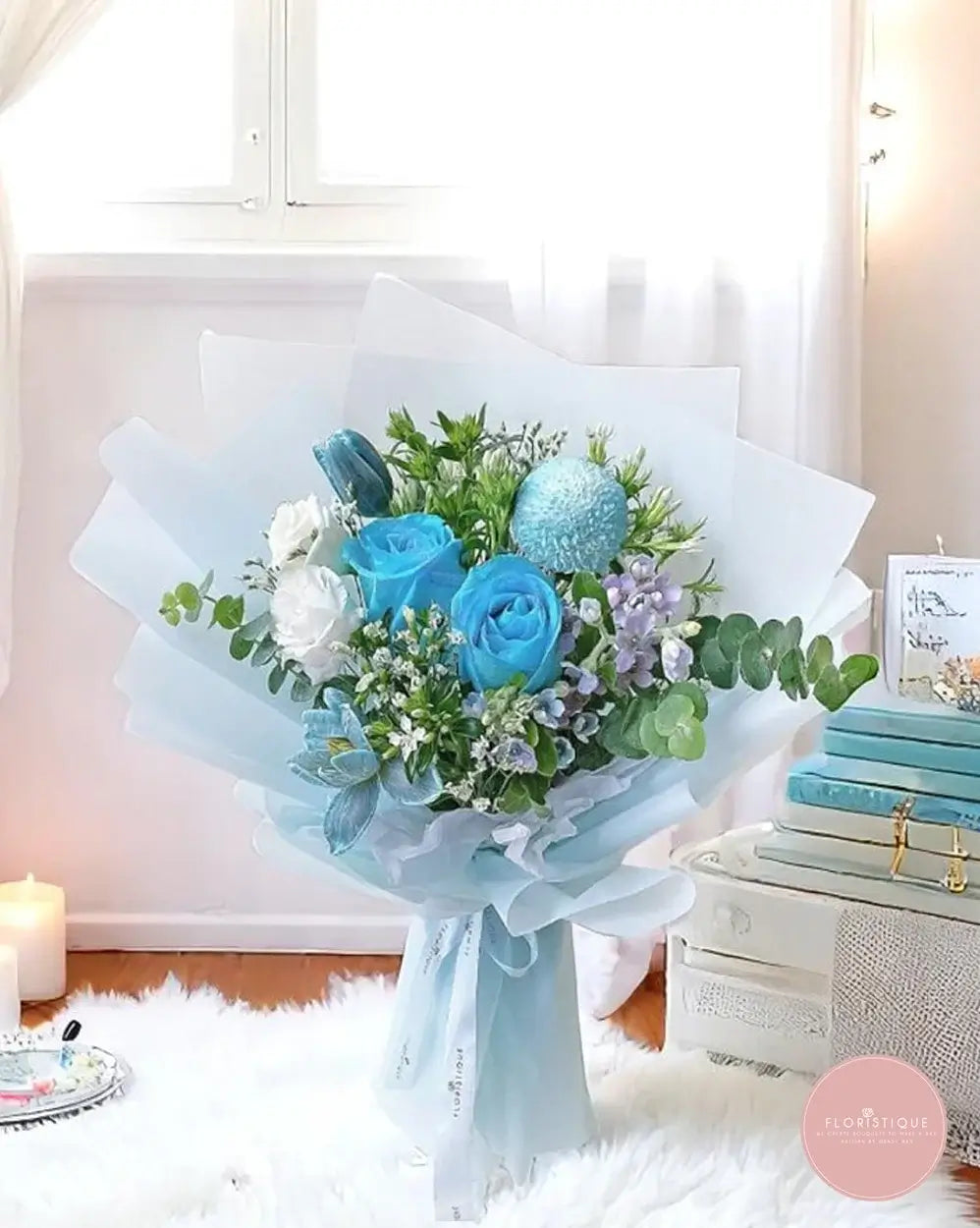 Immerse yourself in the captivating beauty of vivid blue roses paired with creamy white spray buds, delicate lilac fillers, and silvery eucalyptus. Each bloom is hand-selected for its striking color and lasting freshness, then wrapped in soft pastel-blue paper with a flowing ribbon for a modern, elegant finish—perfect for birthdays, congratulations, or making any moment unforgettable.