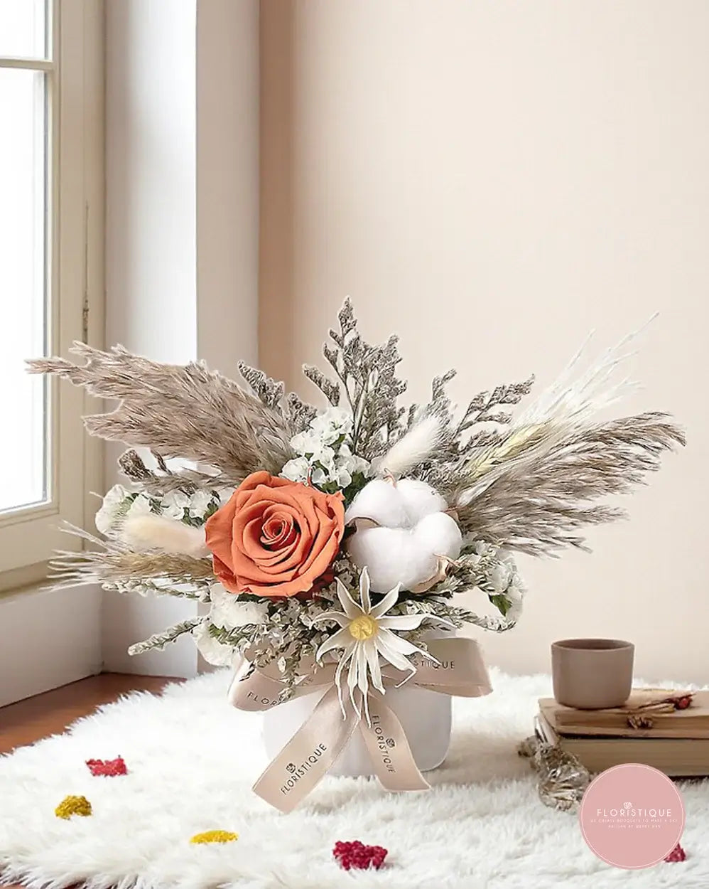 This charming preserved arrangement features a striking orange rose paired with cotton, dried foliage, and dainty fillers, creating a rustic yet elegant display. Styled in a chic vase with a ribbon finish, it’s a thoughtful piece perfect for home décor, gifting, or bringing warmth to any celebration.