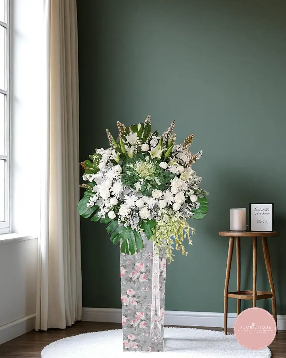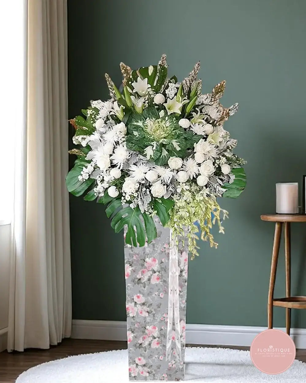 Honor the memory of a loved one with this refined condolence flower stand Singapore. Ideal for wakes and memorial services, it comes with free same-day flower delivery in Singapore, ensuring your condolences are expressed promptly and with elegance.