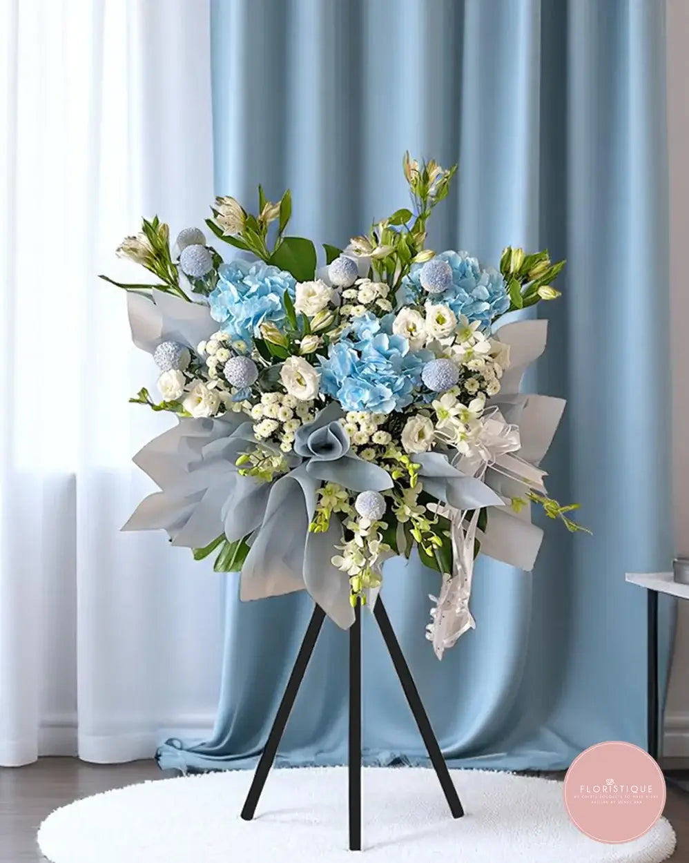 A tranquil arrangement of soft blue carnations, delicate white eustoma, and snow-hued ping pong blooms, gently framed by lush foliage and elegant fillers. This condolence flower stand embodies calm, grace, and a quiet remembrance of a life well-lived.