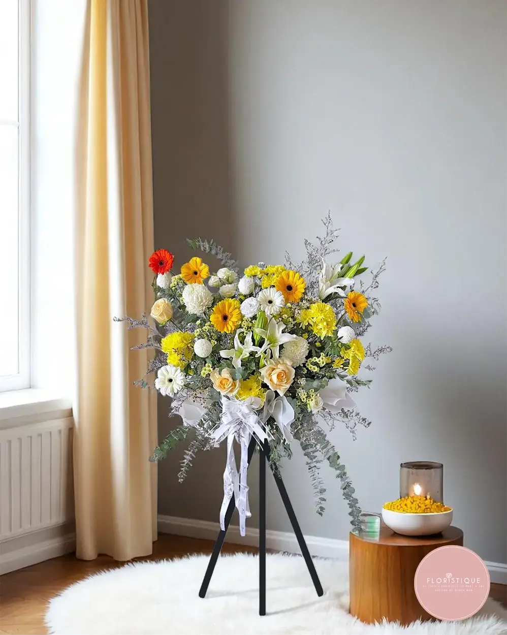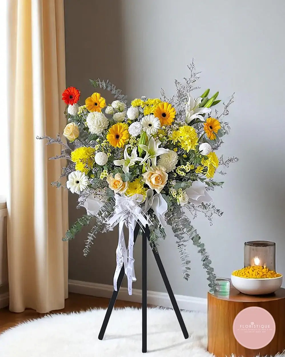 This elegant condolence flower stand features a warm mix of yellow chrysanthemums, creamy roses, and white lilies, delicately balanced with pops of orange and red gerberas. Accented with eucalyptus and lush foliage, it offers a dignified tribute that brings light and comfort during times of sorrow.