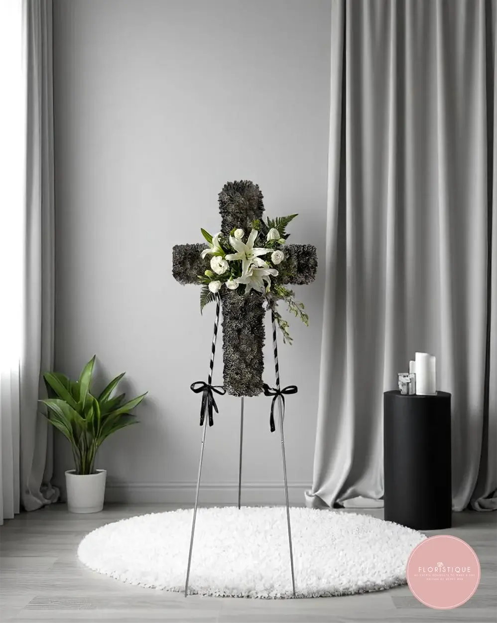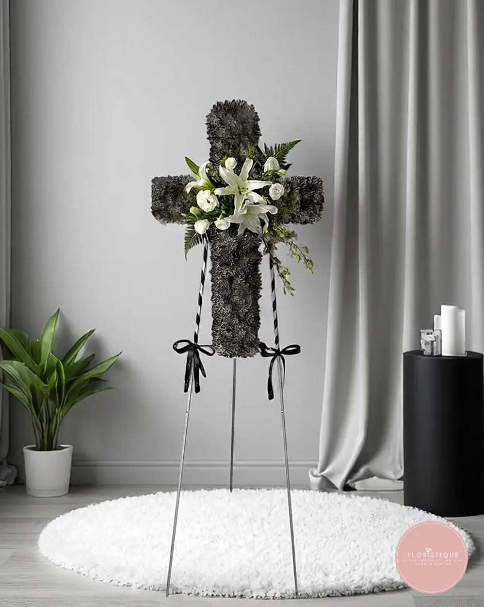 Includes free condolence flower delivery Singapore. A thoughtful choice for Christian funeral flowers Singapore and cross-shaped sympathy stands.