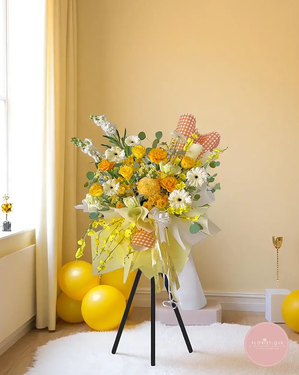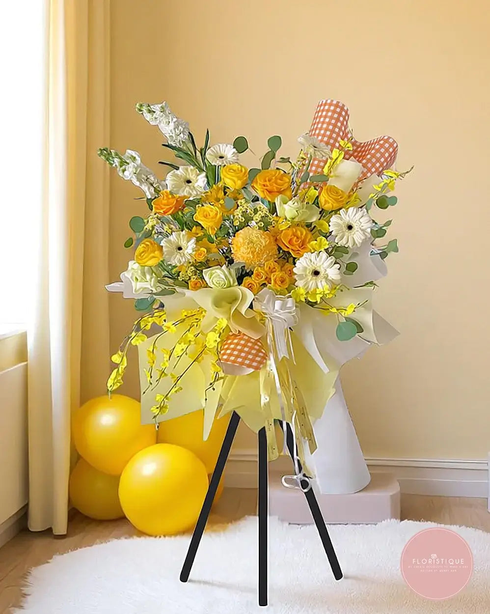 Radiating joy and optimism, this vibrant grand opening flower stand features a cheerful mix of golden yellow roses, ivory gerberas, yellow pompom chrysanthemums, and dancing orchids. Accented with playful heart-shaped checkered balloons and soft wrapping, it's a delightful celebration of new beginnings.