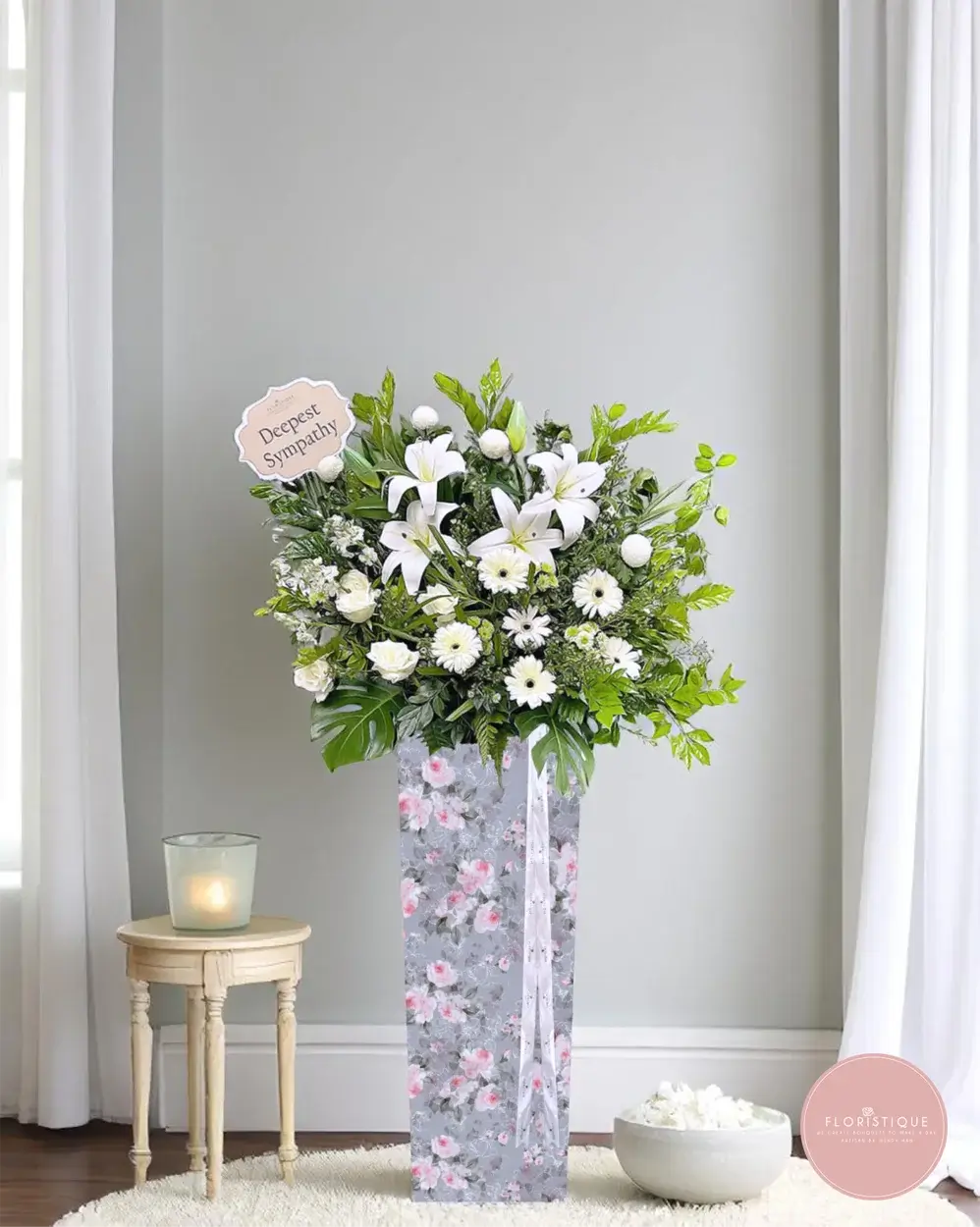 A graceful arrangement of pure white lilies, chrysanthemums, and soft cream roses, surrounded by lush greens, this condolence stand exudes serenity and reverence. A heartfelt tribute that offers comfort and solace in times of mourning.
