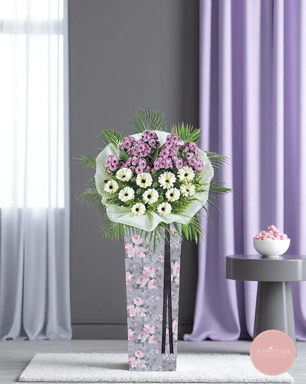 A graceful arrangement of soft purple and white chrysanthemums, delicately wrapped and accented with lush palms, this condolence flower stand radiates quiet strength and sympathy. Thoughtfully designed to bring solace and pay tribute with dignity.