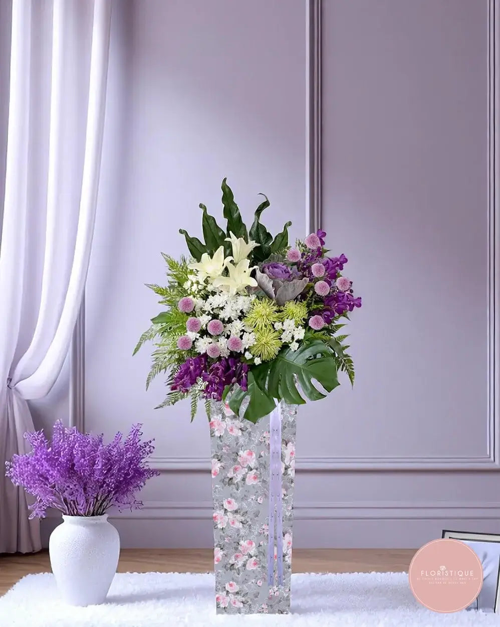 A graceful arrangement of purple statice, cream lilies, and white chrysanthemums, beautifully balanced with lush greens and elegant textures. This serene condolence stand conveys your deepest sympathies with poise and respect.