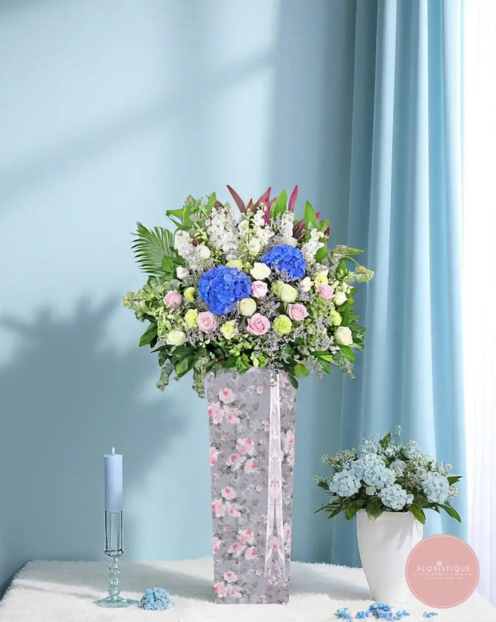 This elegant condolence stand features soothing blue hydrangeas, delicate pink roses, and gentle white stock flowers, nestled among soft greens. A calming tribute designed to offer peace, comfort, and heartfelt remembrance.