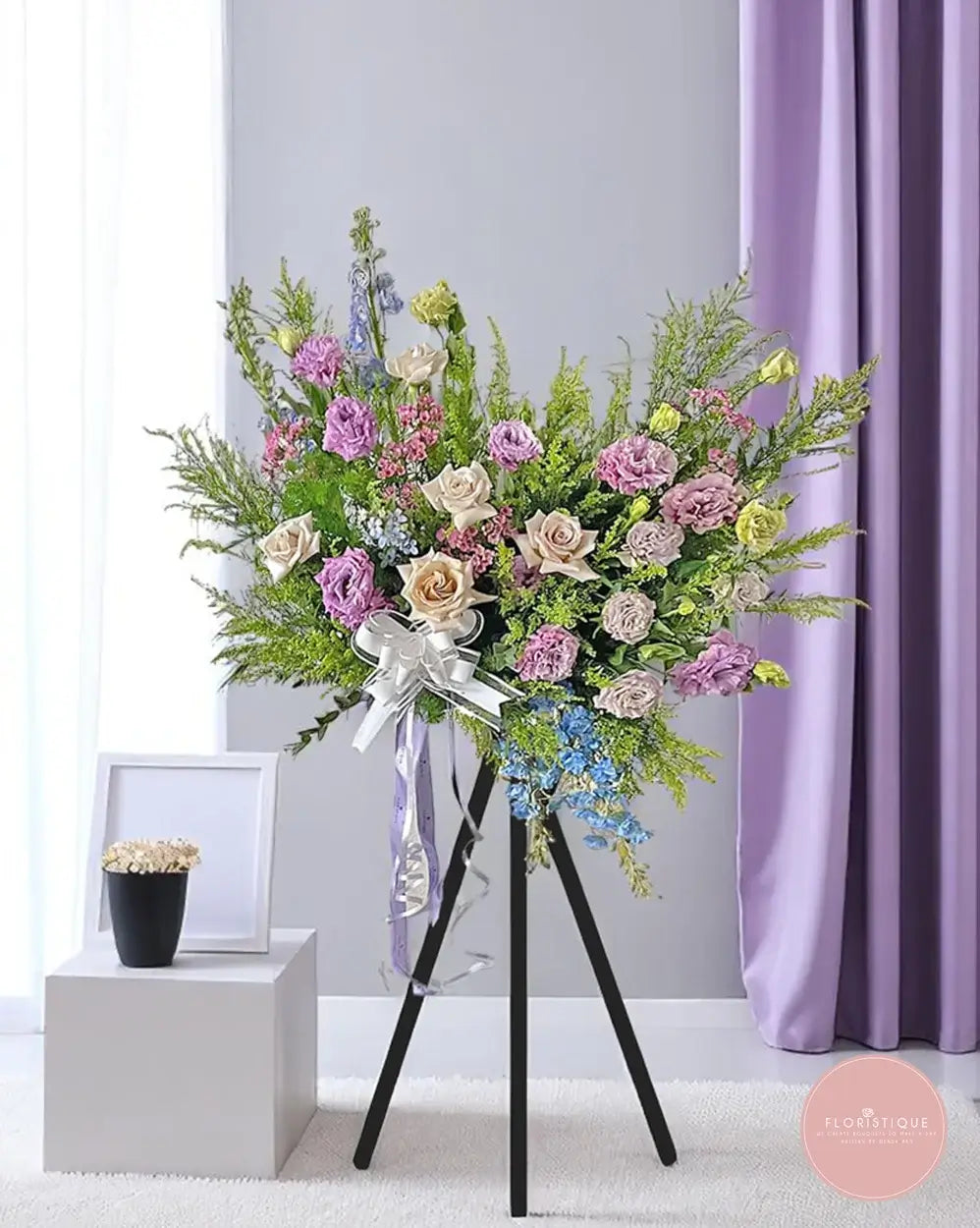 Convey your deepest sympathies with this graceful condolence stand, thoughtfully arranged with soft lilac eustomas, pale champagne roses, touches of blue blooms, and lush greenery. The gentle pastel hues offer a peaceful tribute, while the flowing white and lavender ribbons add a touch of heartfelt elegance.