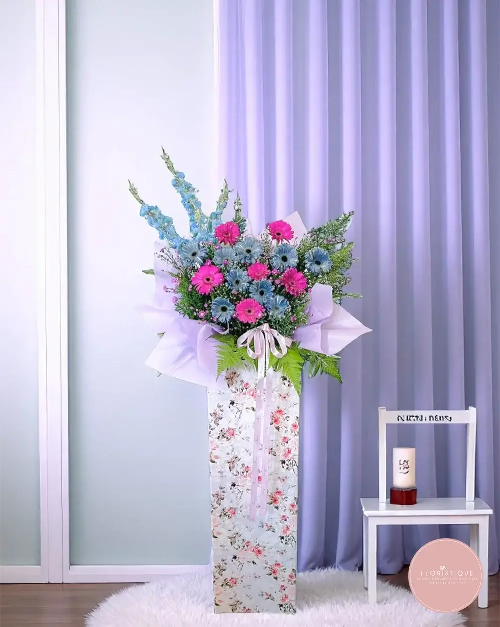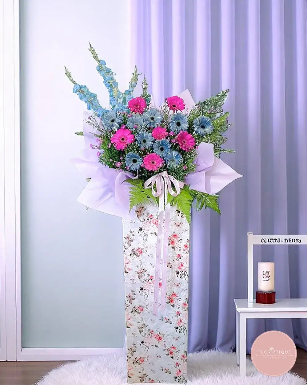 A striking tribute of violet gerberas and sky blue blooms, softened with pastel wrapping and lush greenery. This condolence stand conveys quiet strength and serene remembrance, offering a heartfelt expression of sympathy in delicate hues.