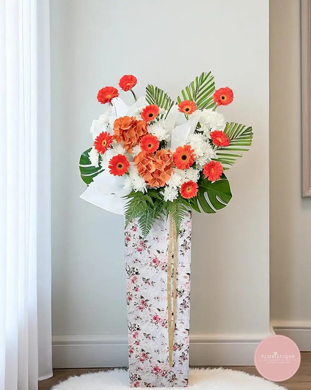 Bright orange gerberas and hydrangeas offer a gentle touch of warmth amidst the calm of pristine white chrysanthemums and tropical foliage. Arranged in a tall, floral-patterned stand, this arrangement expresses a heartfelt farewell with both dignity and hope.