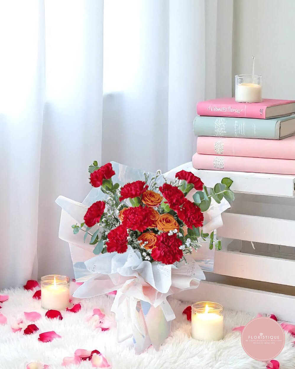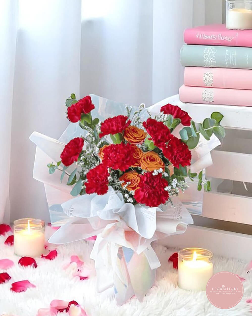 Express passion with our Red Carnation & Orange Spray Rose Bouquet — a dazzling arrangement featuring nine vibrant red carnations and the radiant charm of orange spray roses. This bouquet symbolizes love, passion, and enthusiasm. The rich red and warm orange hues create a stunning contrast, making it an ideal gift to express heartfelt emotions and celebrate special occasions with flair.