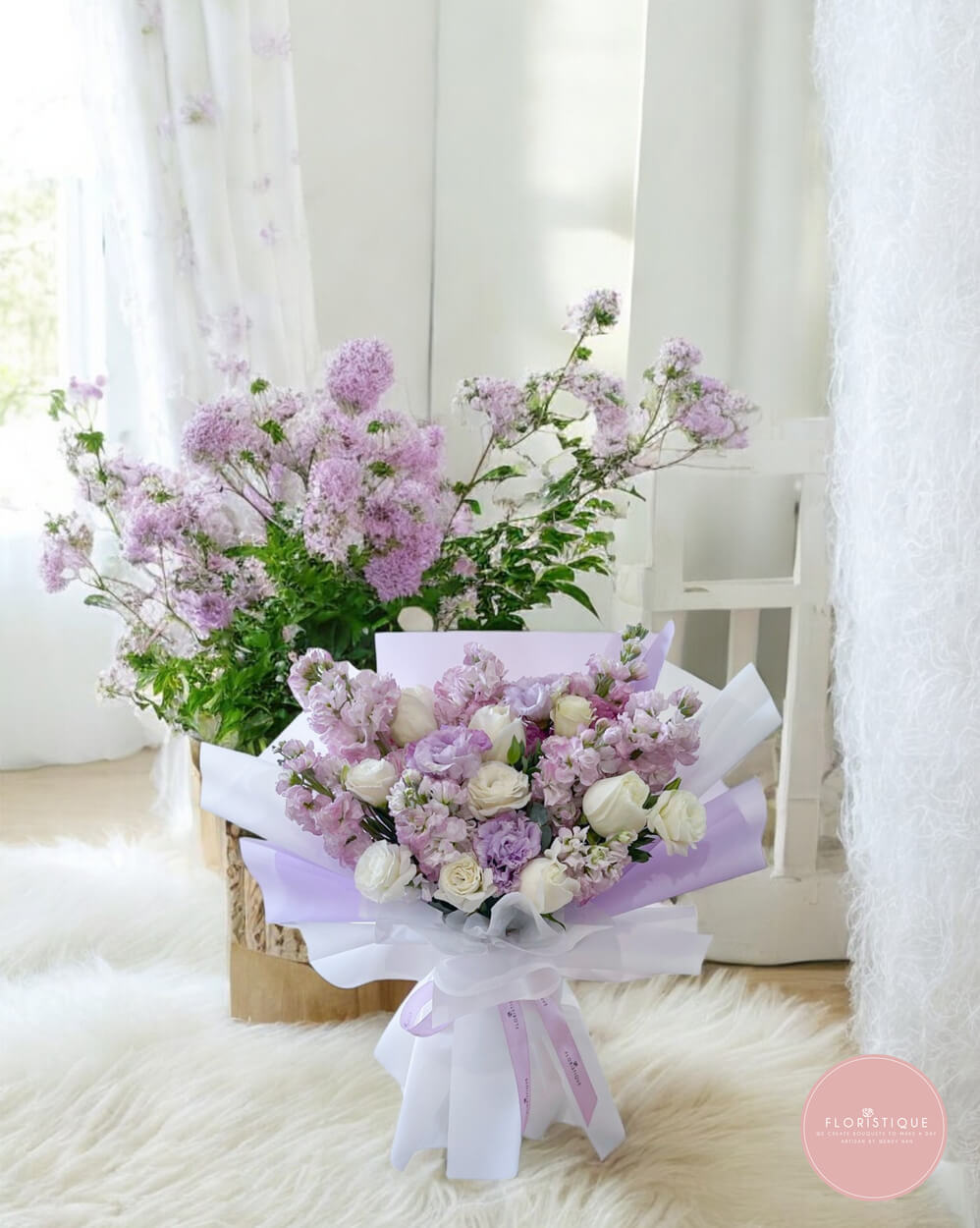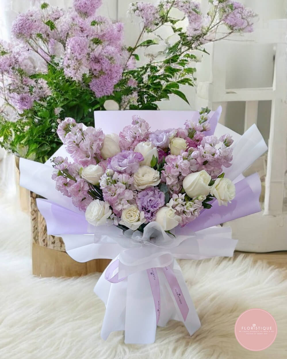 This elegant bouquet features a delicate blend of lavender-toned blooms and white roses & eustoma, beautifully wrapped in soft lilac and white layers. Graceful and serene, it’s a perfect gift for birthdays, anniversaries, or simply to bring a calming touch of beauty to someone’s day.