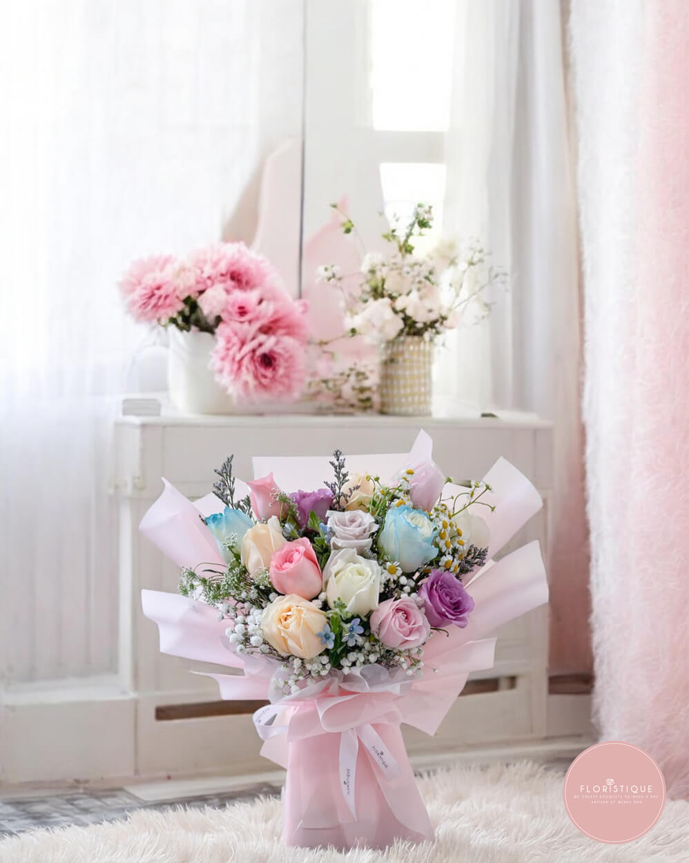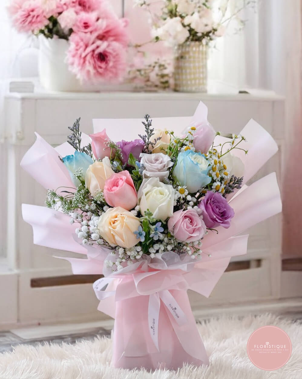 This enchanting hand bouquet brings together a delicate mix of pastel roses in soft blush, cream, lavender, and gentle blue tones, artfully accented with baby’s breath, chamomile daisies, and light seasonal fillers. Wrapped in blush pink layers and finished with a flowing ribbon, the arrangement feels romantic, graceful, and full of charm—perfect for birthdays, anniversaries, congratulations, or simply to send a sweet and thoughtful surprise.