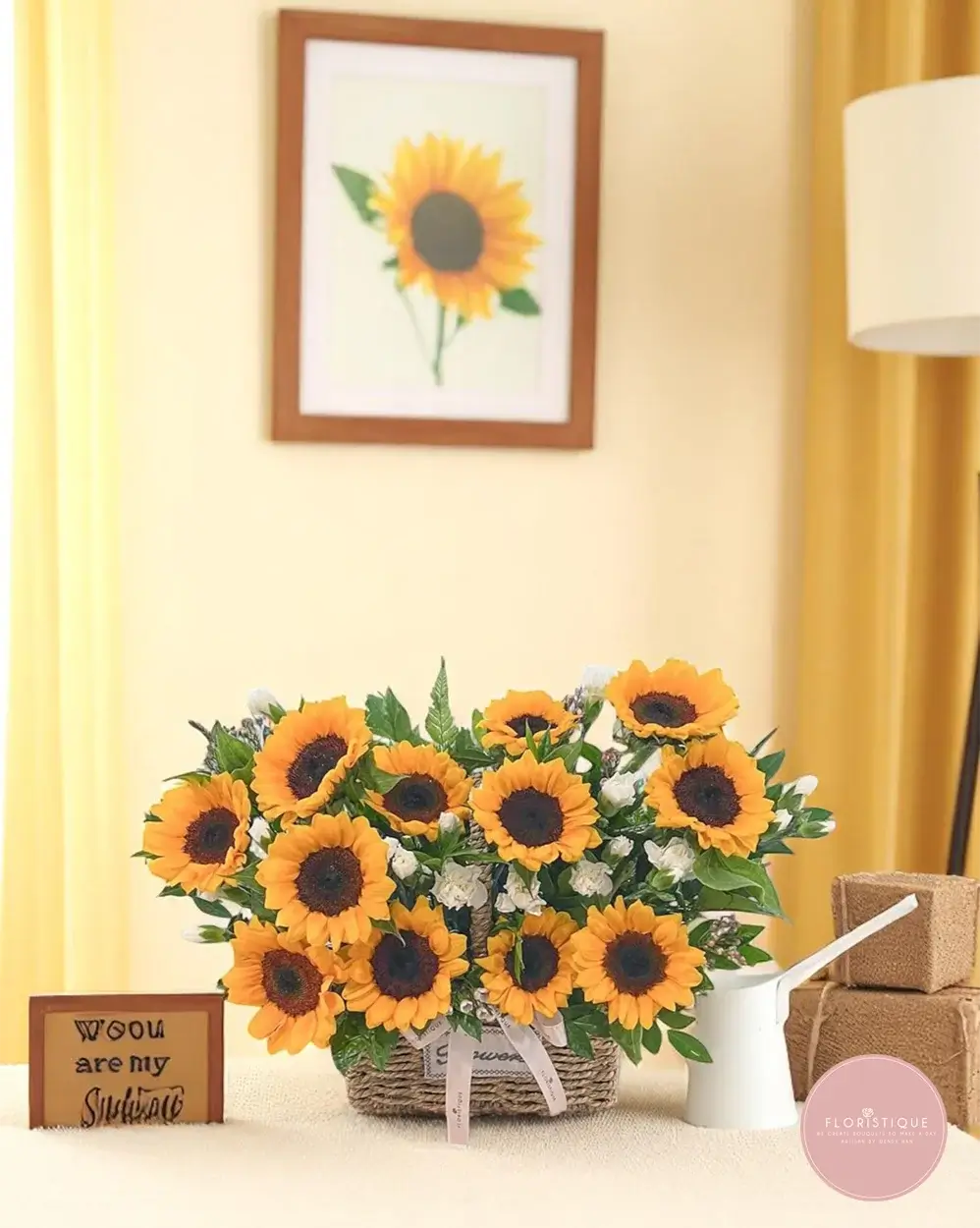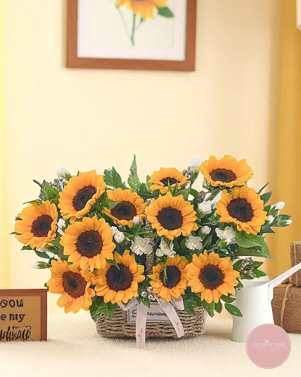 Bursting with sunshine and cheer, this vibrant sunflower basket features a joyful medley of golden-yellow sunflowers paired with soft white fillers and lush greenery. Set in a rustic woven basket, this arrangement brings a touch of countryside charm to any setting.