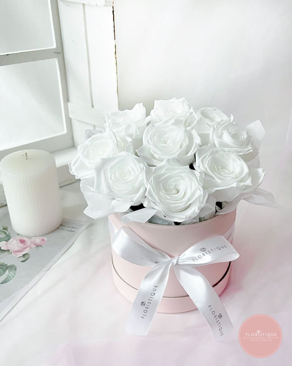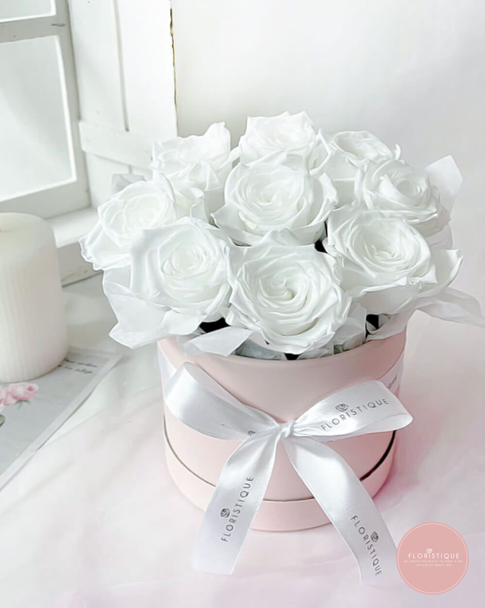 Elevate your flower gifting with our Everlasting Preserved White Roses, artfully arranged in a chic round box. Each bloom encapsulates eternal love, making this exquisite gift a timeless expression of your affection.