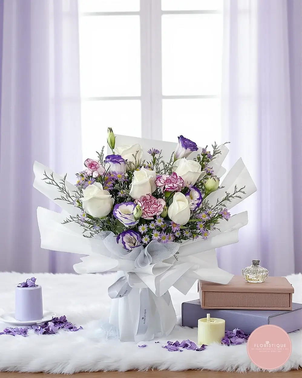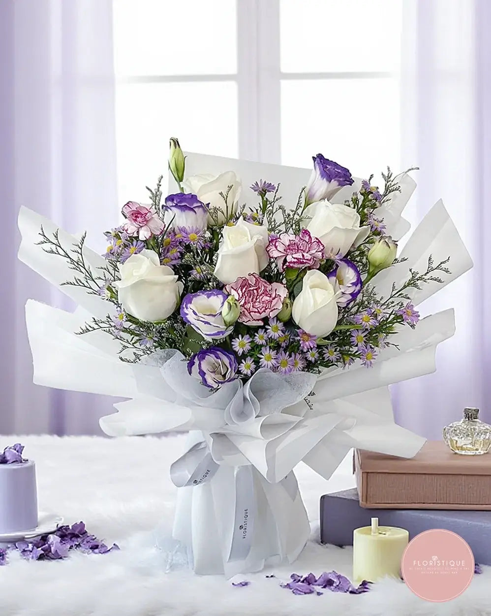 A graceful bouquet featuring pristine white roses paired with purple-edged eustoma, soft purple carnations, and dainty ester fillers. Wrapped in layers of elegant white paper and tied with a satin ribbon, this arrangement exudes sophistication, charm, and delicate beauty.