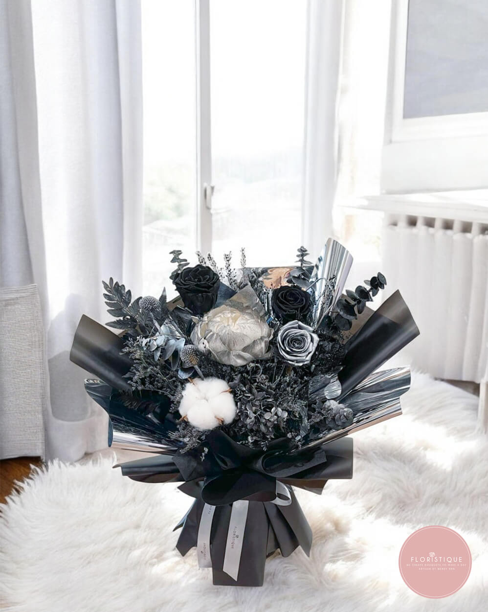 Bold and sophisticated, the Midnight Luxe Preserved Bouquet features an exquisite selection of preserved black and silver roses, frosted foliage, silver accents, and fluffy cotton blooms. Wrapped in sleek black and chrome-toned paper, this striking arrangement radiates modern elegance with a dramatic flair. Perfect for anniversaries, proposals, or unforgettable statements of love.