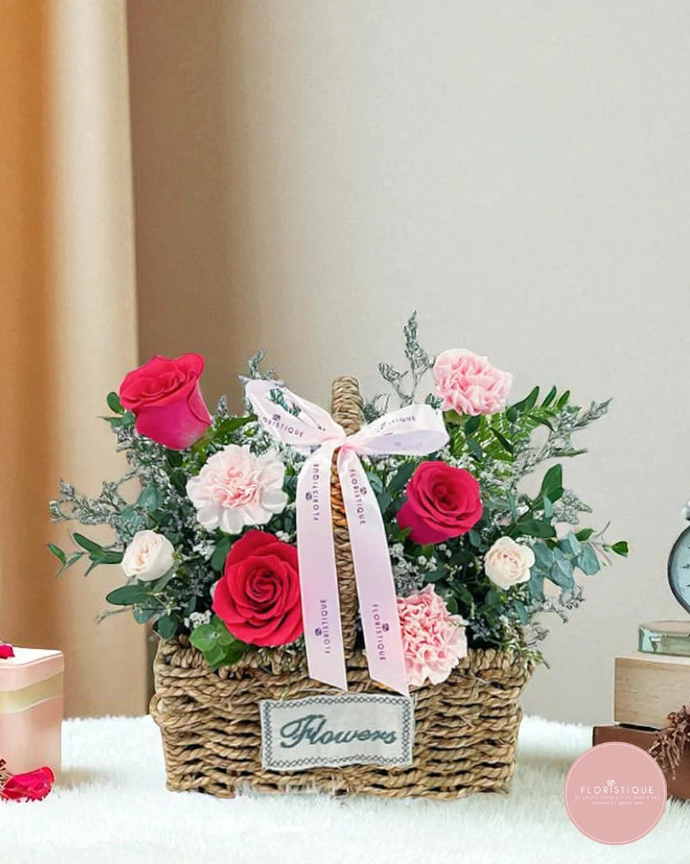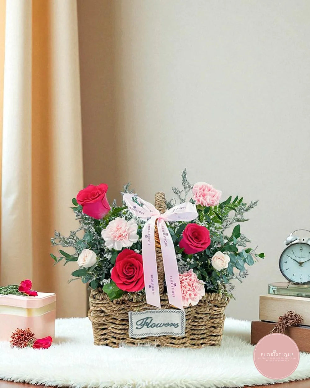 This charming basket brims with a vibrant mix of red and pink roses, soft cream carnations, and fresh eucalyptus leaves. Finished with a pink satin ribbon and rustic woven base, it’s a thoughtful blend of elegance and romance.