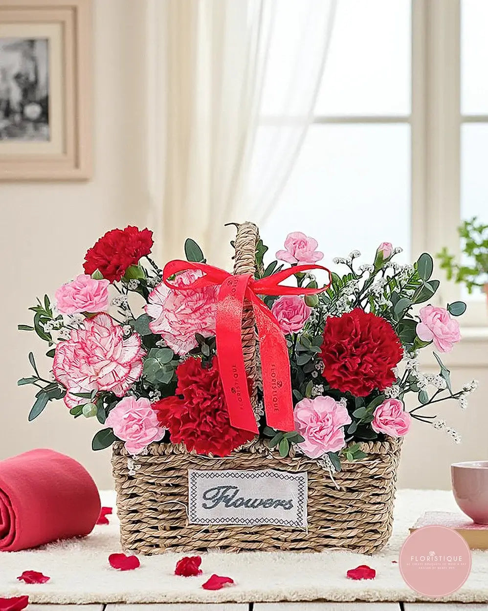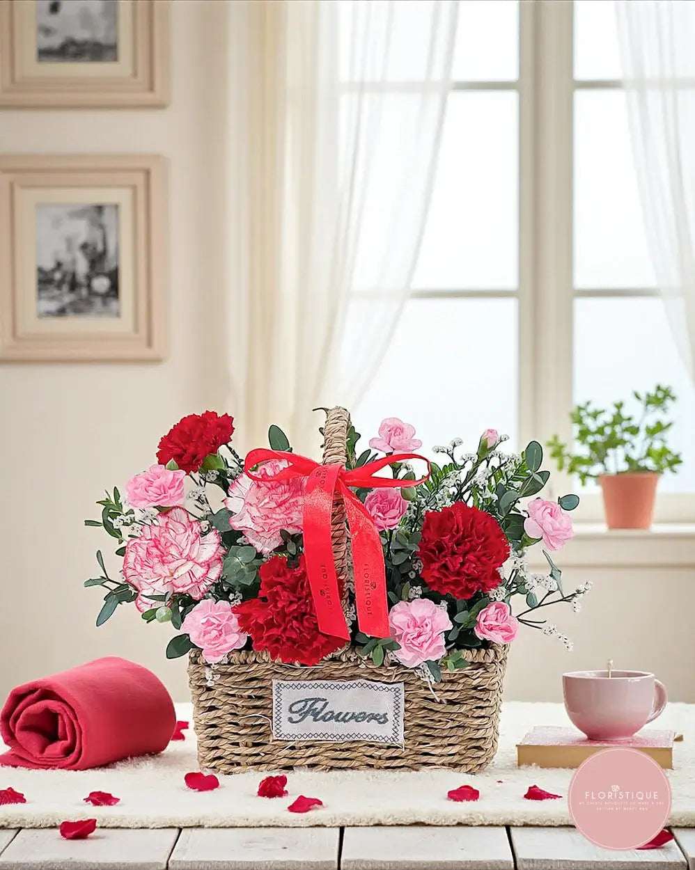 Celebrate love and admiration with this vivid basket of red and pink carnations, beautifully accented with delicate eucalyptus and dainty fillers. The rich contrast of deep red blooms and soft pink tones brings out warmth and affection in every detail, tied together with a bold red ribbon for a striking finish.
