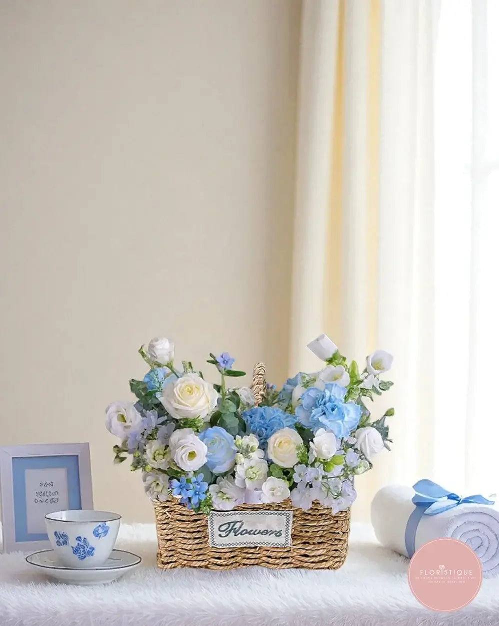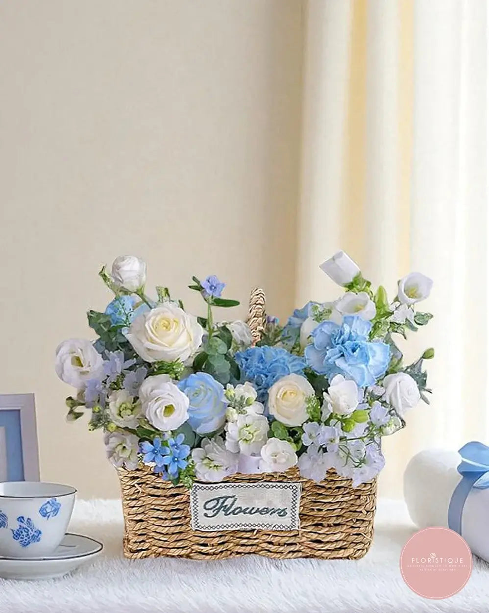 Tranquil, graceful, and soothing to the soul — Serene Blue Pastel Basket features a delicate combination of sky-blue hydrangeas, white ranunculus, light blue delphiniums, and soft fillers, all arranged in a charming woven basket. Set against a backdrop of soft curtains and natural light, this arrangement radiates calm elegance and thoughtful beauty.