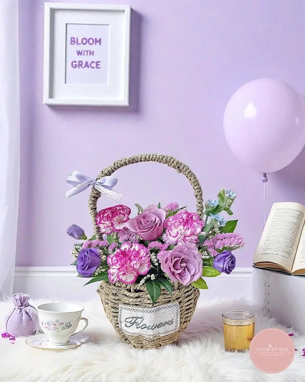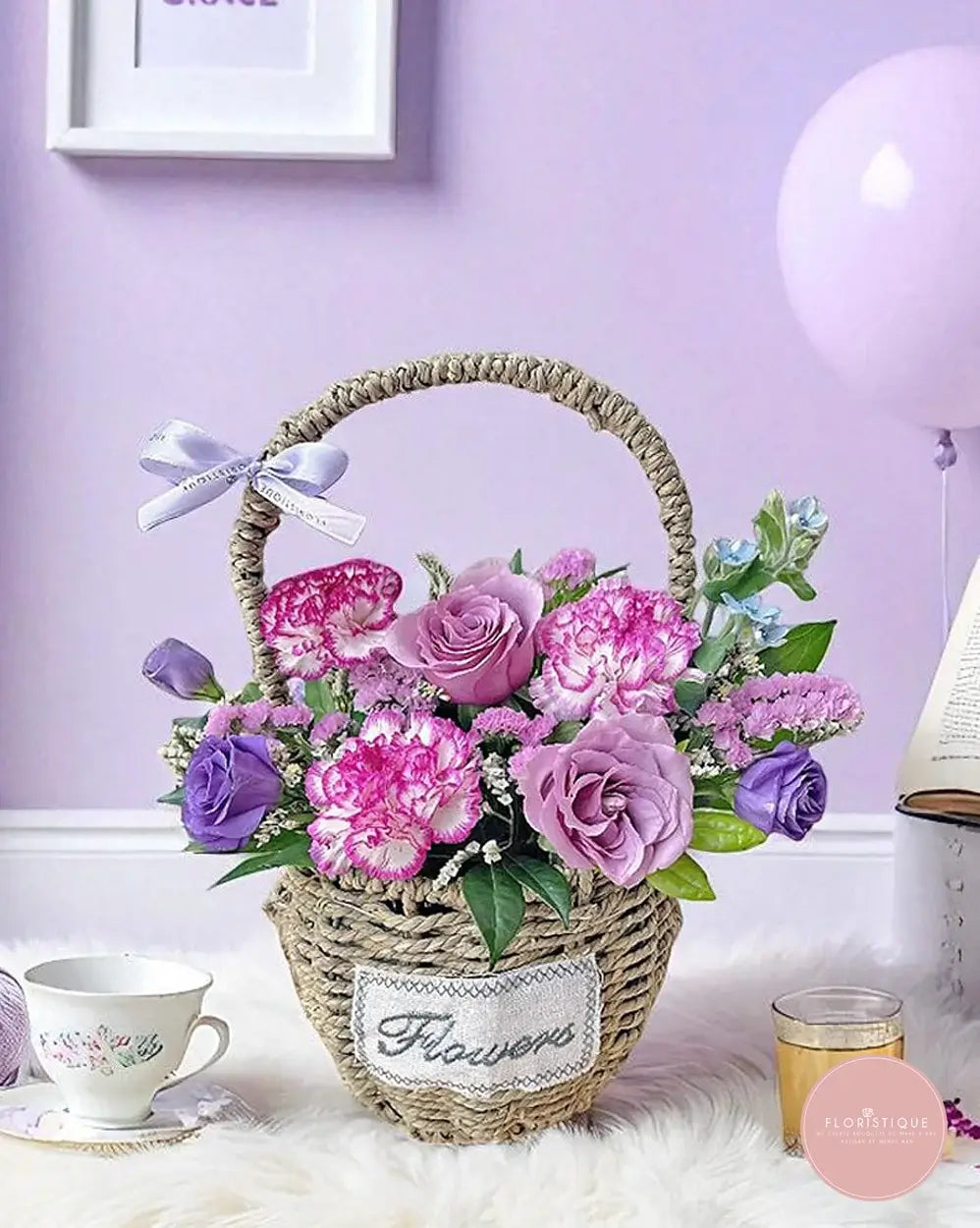 Delight in the soft elegance of this charming basket arrangement, featuring a graceful medley of lavender roses, purple eustomas, pink variegated carnations, and delicate fillers nestled in a rustic woven basket. Accented with fresh greenery and finished with a satin ribbon, this floral piece exudes gentle beauty and timeless charm — perfect for birthdays, anniversaries, or simply to brighten someone’s day.